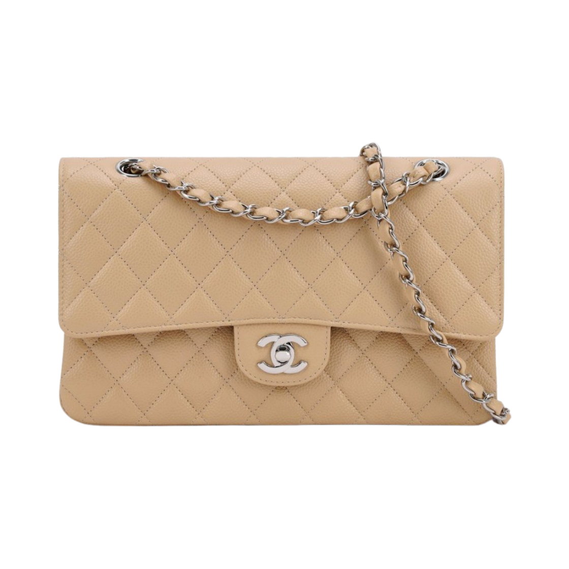 샤넬 클래식 미디움 플랩백 그레인드 카프스킨 & 실버 메탈 베이지