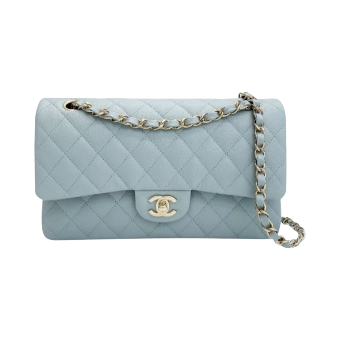 샤넬 클래식 미디움 플랩백 그레인드 카프스킨 & 골드 메탈 라이트 블루