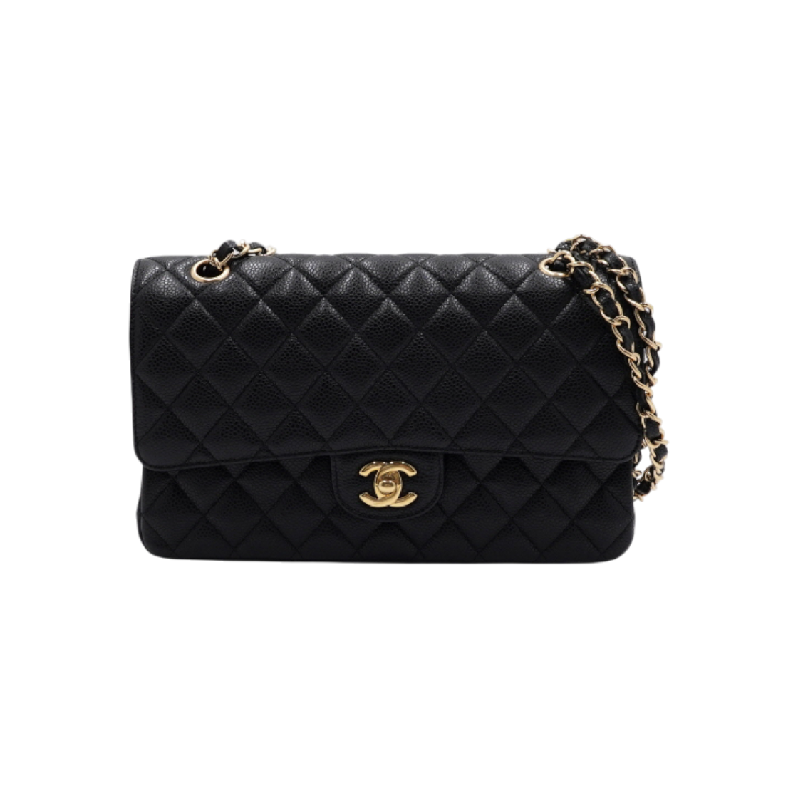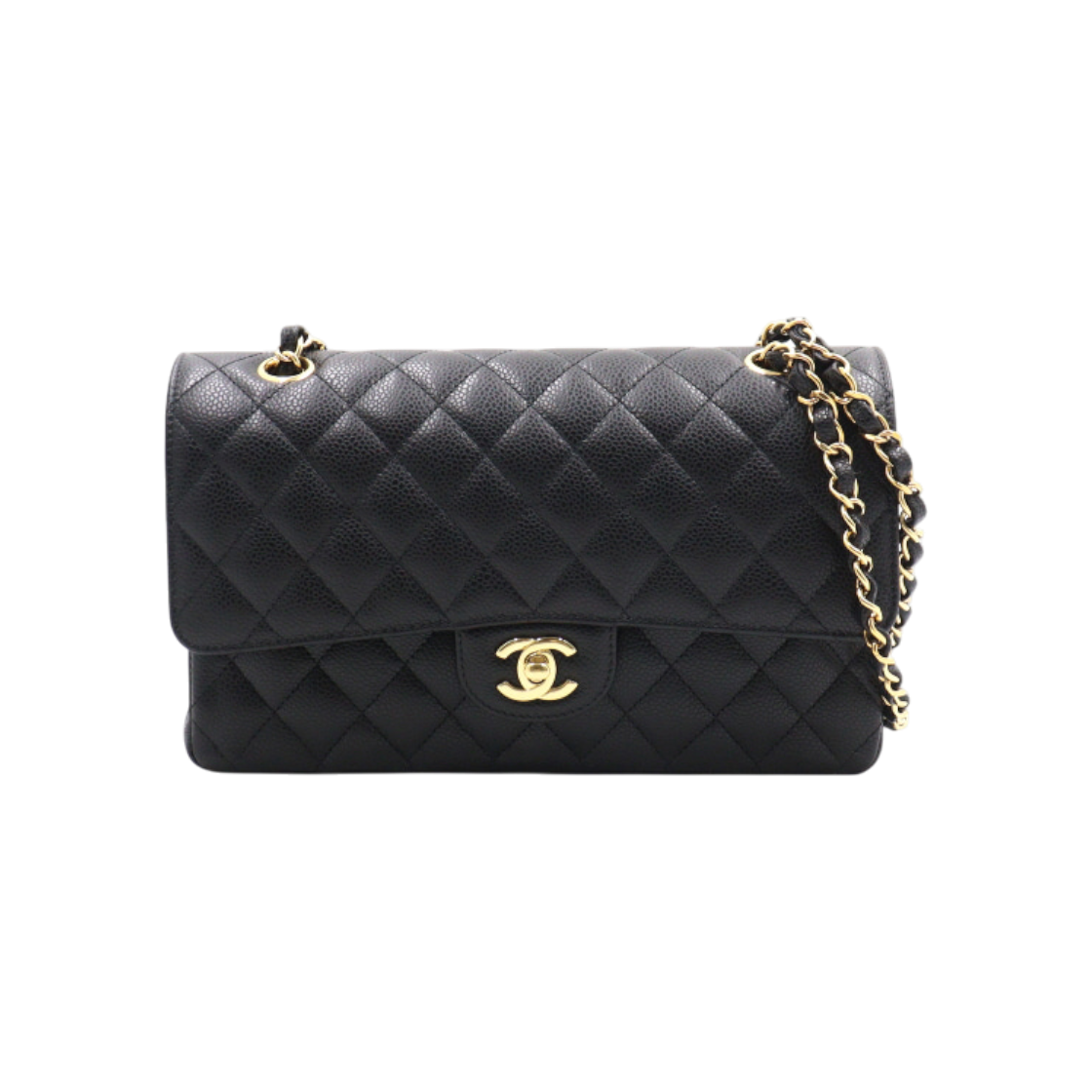 샤넬 클래식 미디움 플랩백 그레인드 카프스킨 & 골드 메탈 블랙