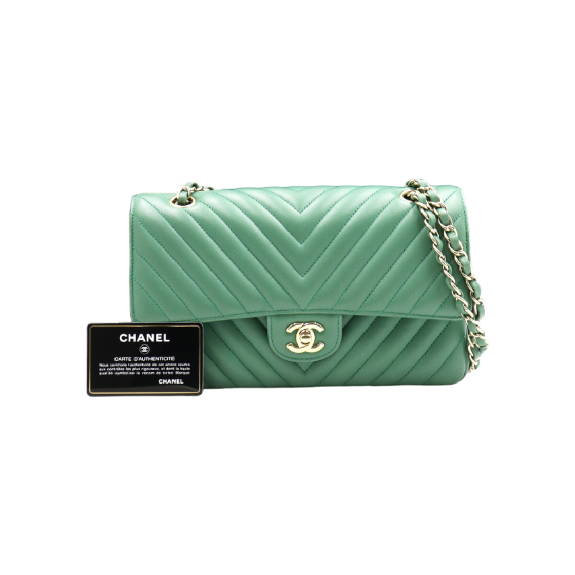 샤넬 A01112 그린 램스킨 쉐브론 클래식 미듐 샴페인골드CC 금장체인 숄더백 aa47270