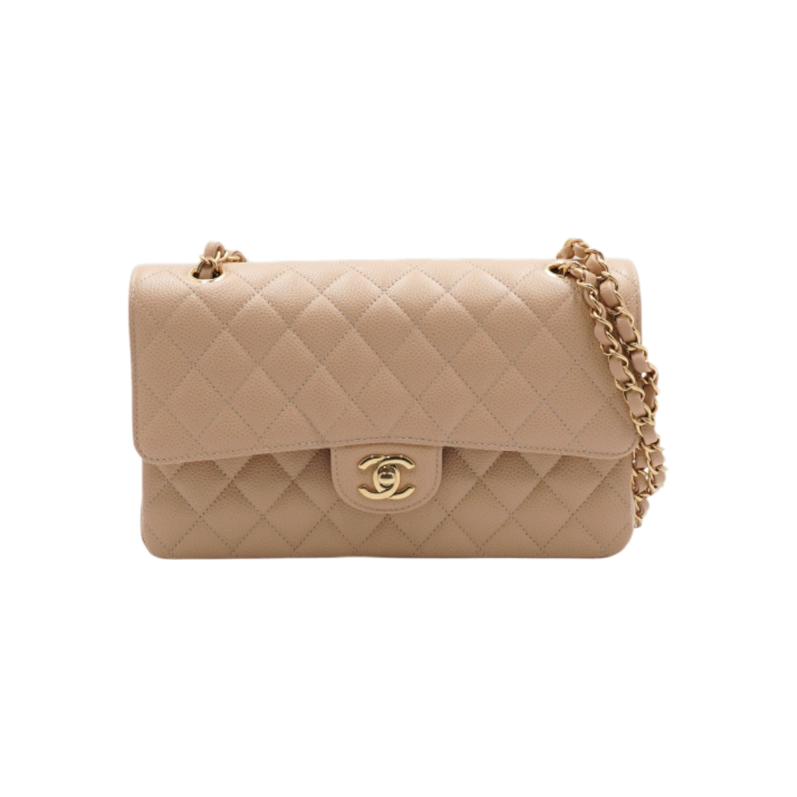 샤넬 클래식 미디움 플랩백 그레인드 카프스킨 & 골드 메탈 라이트 베이지