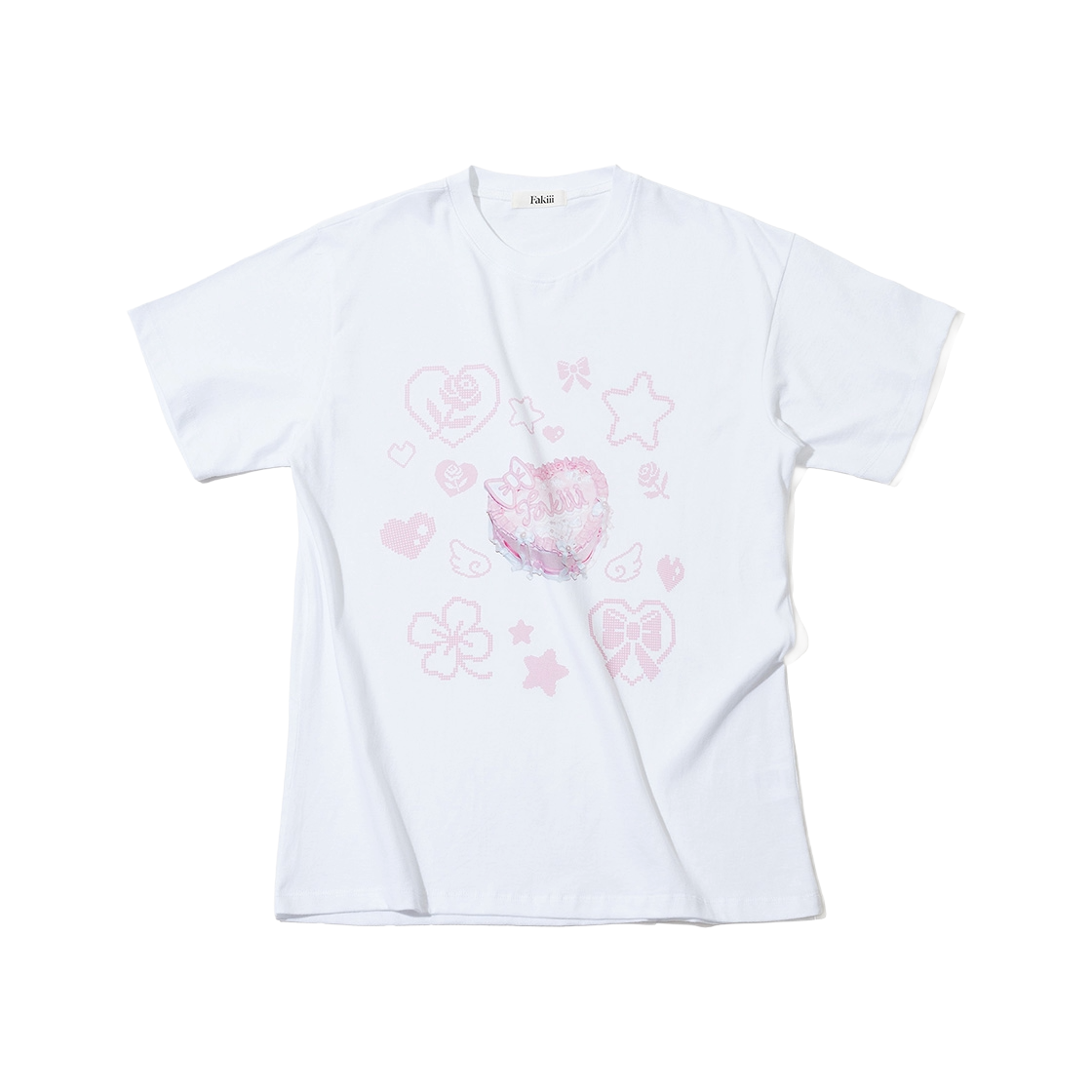 페이키 핑크 하트 케이크 픽셀 티셔츠 화이트