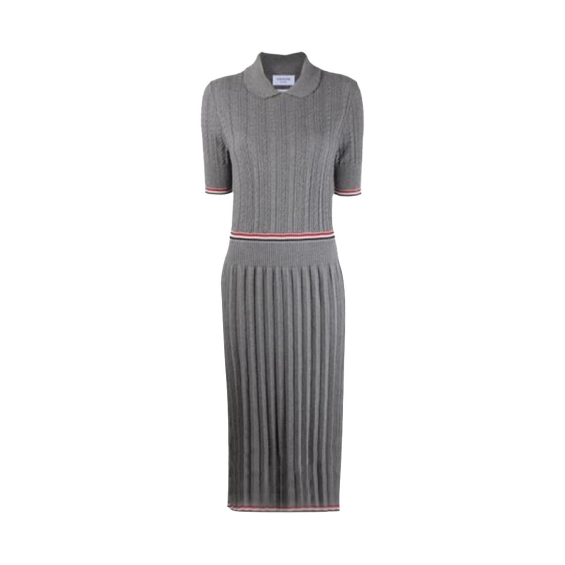 (W) 톰브라운 케이블 텍스처 오버트위스트 코튼 스트라이프 프레이밍 앤 웨이스트밴드 플리츠 빌로우니 폴로 드레스 라이트 그레이