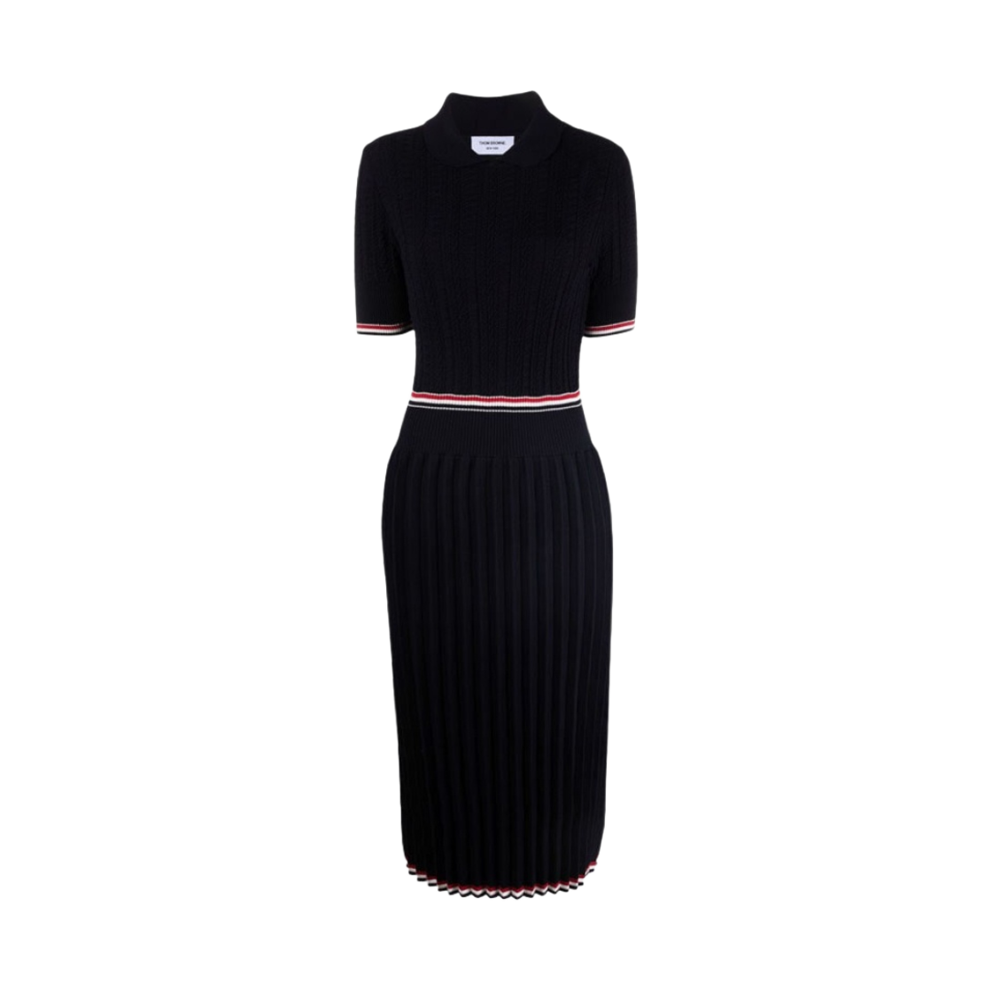 (W) 톰브라운 케이블 텍스처 오버트위스트 코튼 스트라이프 프레이밍 앤 웨이스트밴드 플리츠 빌로우 니 폴로 드레스 네이비