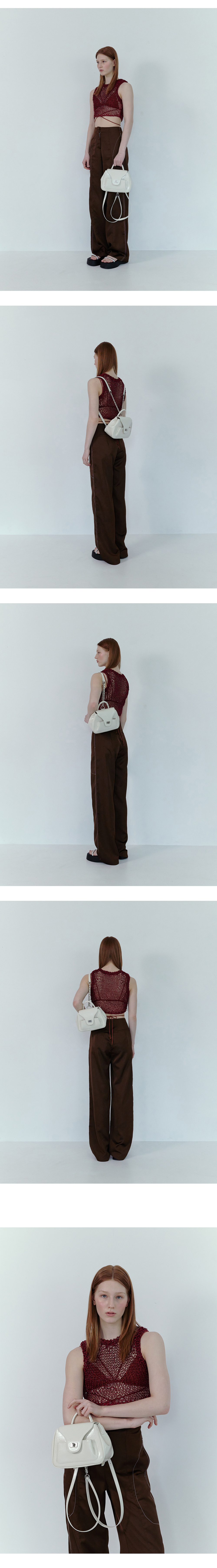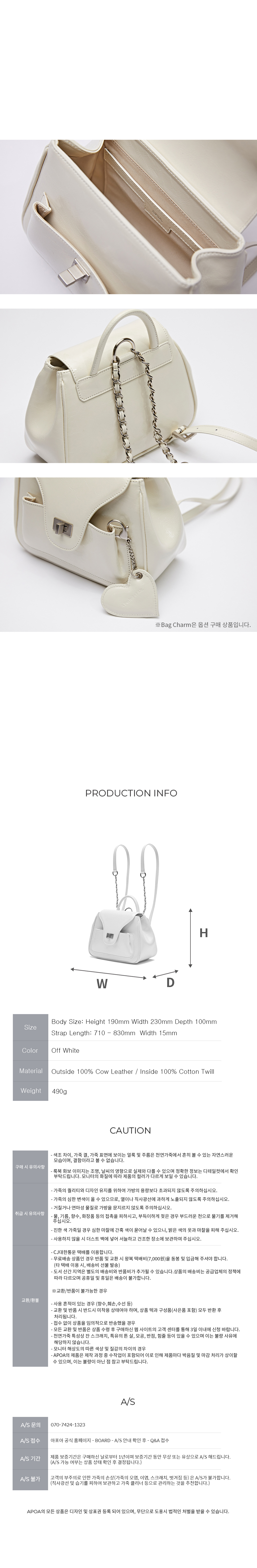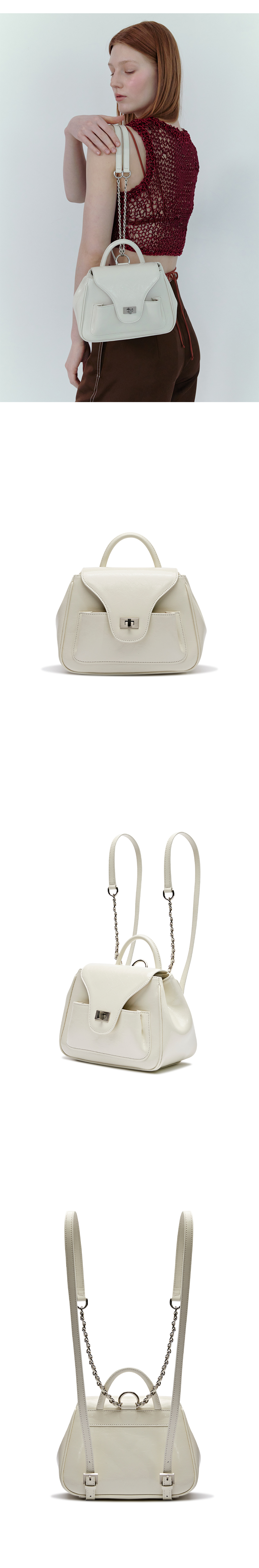 Pao chain backpack APOA 시그니처 디자인인 Pao 라인을 기반하여 구조적인 변형을 준 디자인의 Pao 시리즈 backpack입니다. 크랙 텍스처의 카우 레더를 사용하여, 탑 핸들 디테일을 추가한 형태로 토트, 숄더, 백팩 3way로 다양한 활용이 가능합니다. 뒷면 스트랩에 체인과 가죽끈을 연결하여 편안한 사용감으로 제작된 제품입니다.