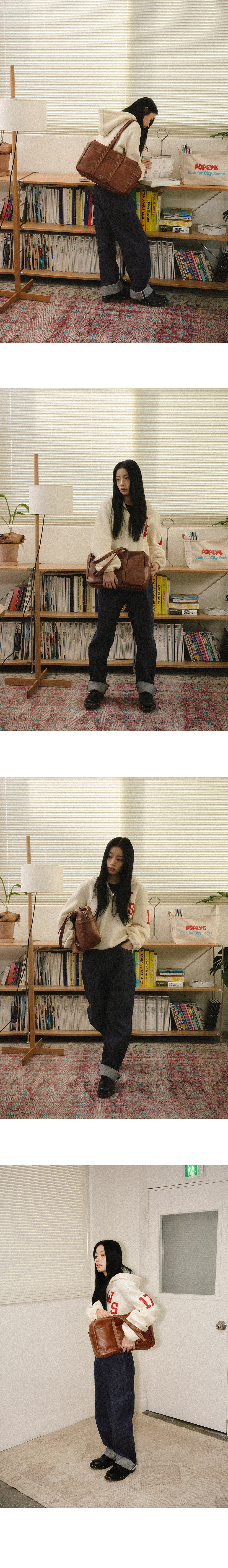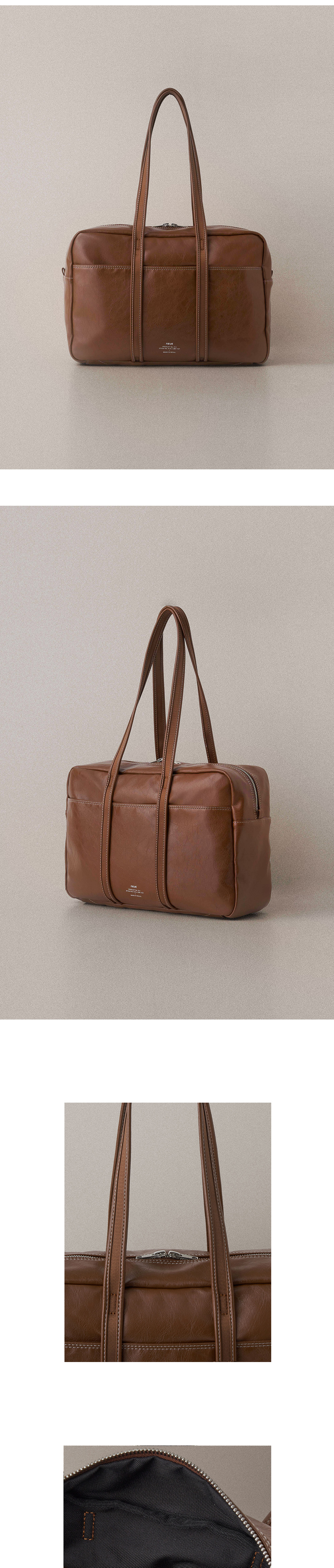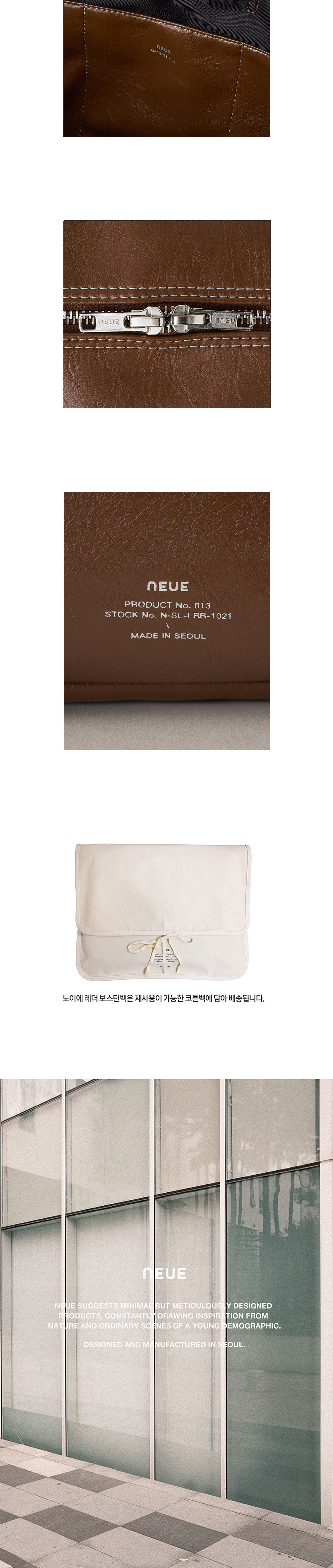 - 자연스러운 크랙과 소프트한 질감의 artificial leather - 은은한 광택감의 2way 실버 지퍼 - 가죽으로 바이어스한 어깨 스트랩 디테일 - 밀도 높은 폴리 안감과 외부 포켓1 내부 포켓3 - 바닥면 포켓에 자유롭게 넣었다 뺄 수 있는 하드한 보강재 - 노이에 로고 각인 - 재사용이 가능한 코튼백 포장