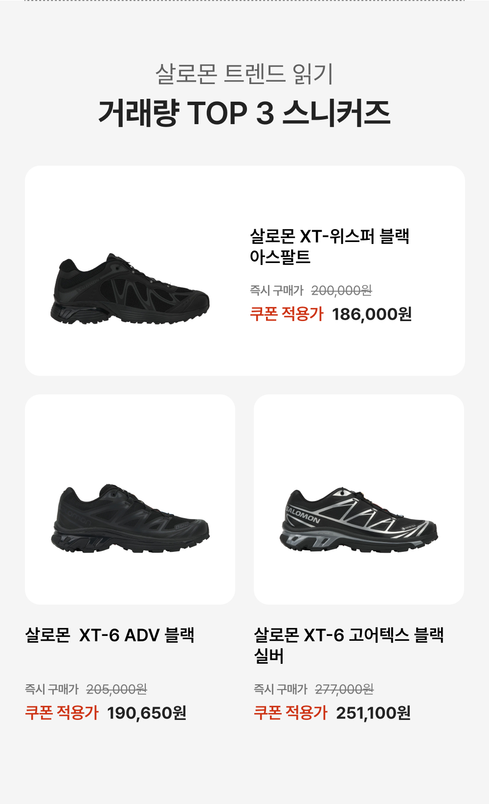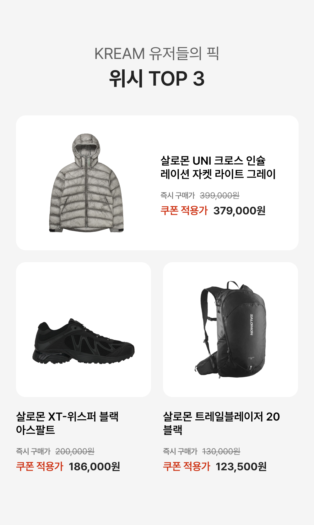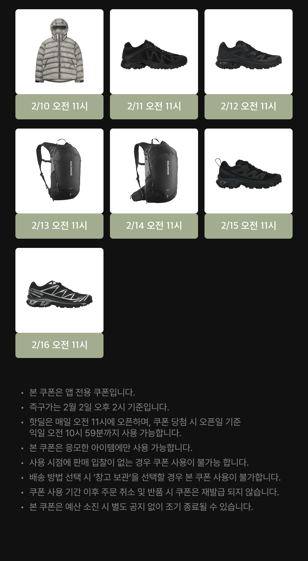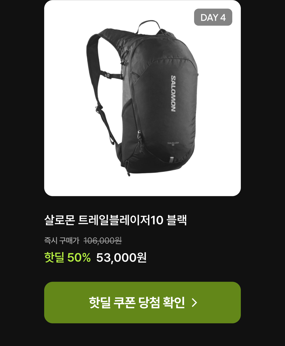 본 쿠폰은 살로몬 상품에 한하여 사용 가능하며, 일부 상품은 쿠폰 사용이 불가할 수 있습니다.