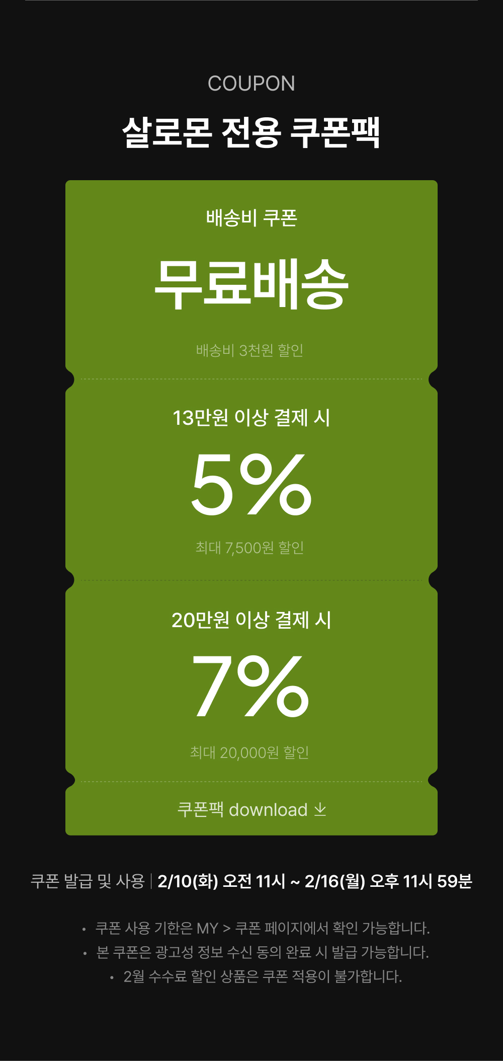 본 쿠폰은 사용 기간(2/10 11:00 ~ 2/16 23:59) 내 1회 사용 가능합니다.