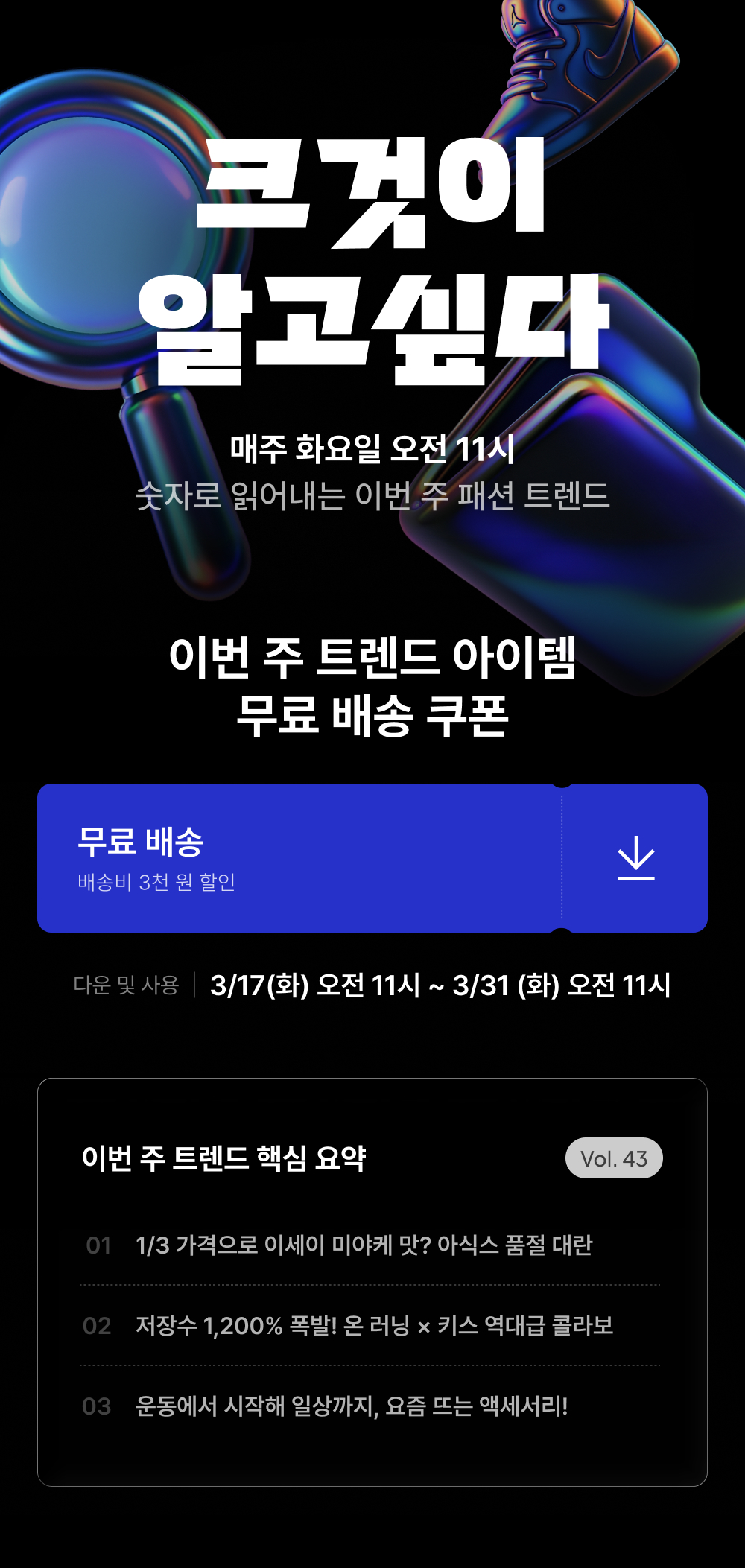본 쿠폰은 ' 크것이 알고싶다 Vol.43'에 소개된 상품에 한해 적용 가능하며, 일부 상품은 적용 불가합니다.