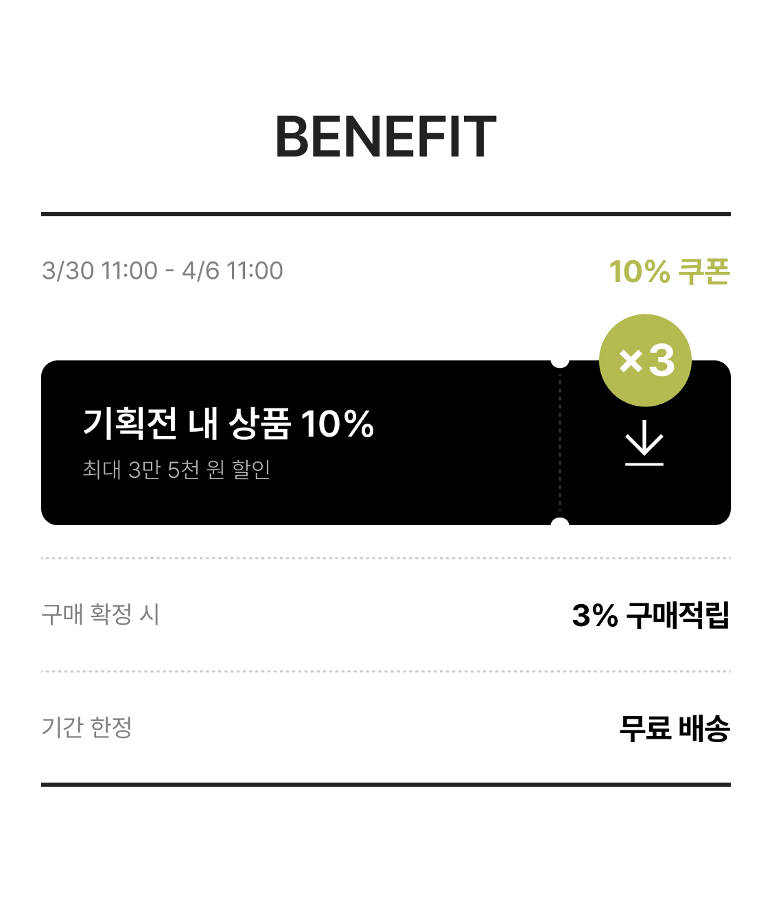 각 쿠폰은 발급 기간 내 계정 당 1회씩 총 3회 다운 가능합니다.
