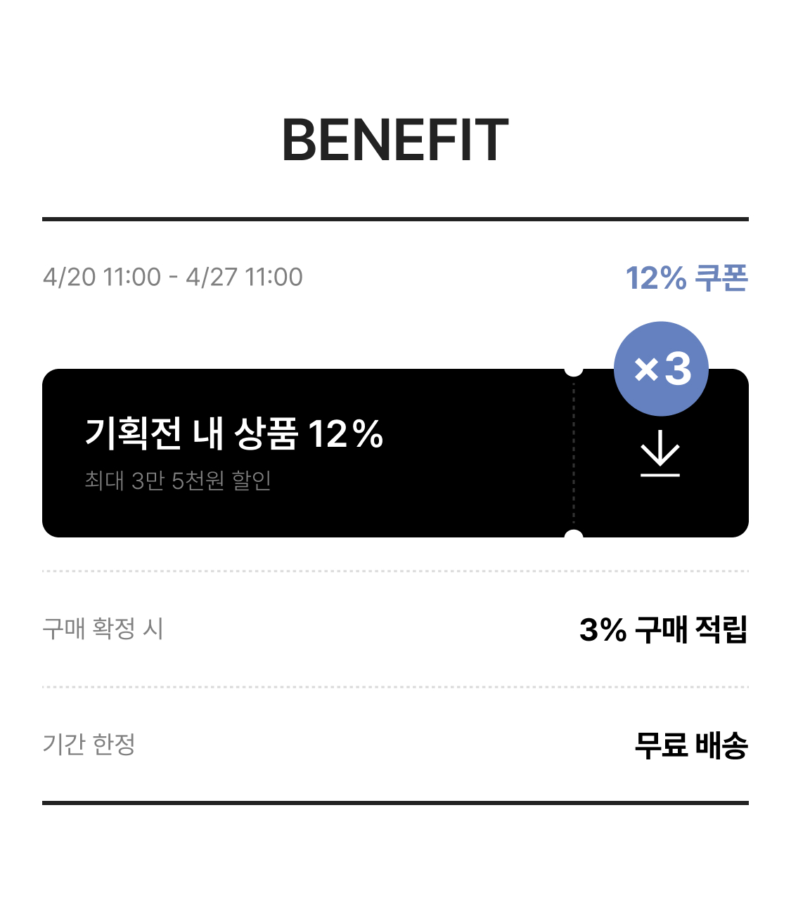 쿠폰은 발급 기간 내 계정 당 1회 다운 가능합니다.