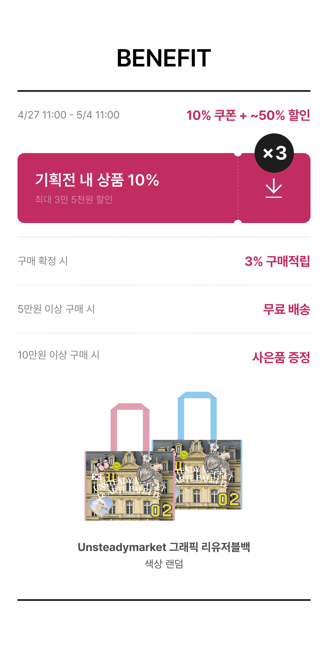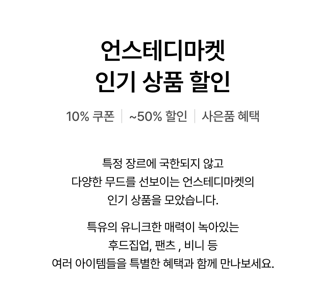 본 쿠폰은 언스테디마켓 상품에 한해 적용 가능하며, 일부 상품은 적용 불가합니다.