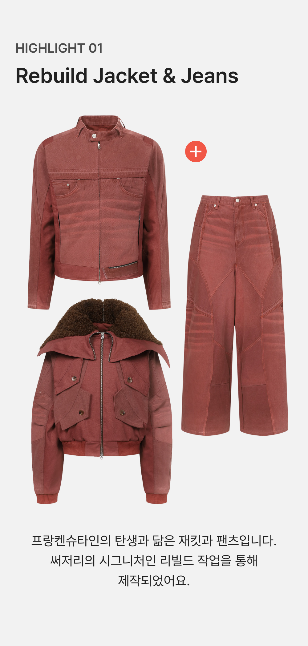 써저리 x 프랑켄슈타인 크리처 엑소-쉘 후드 데님 자켓 레드