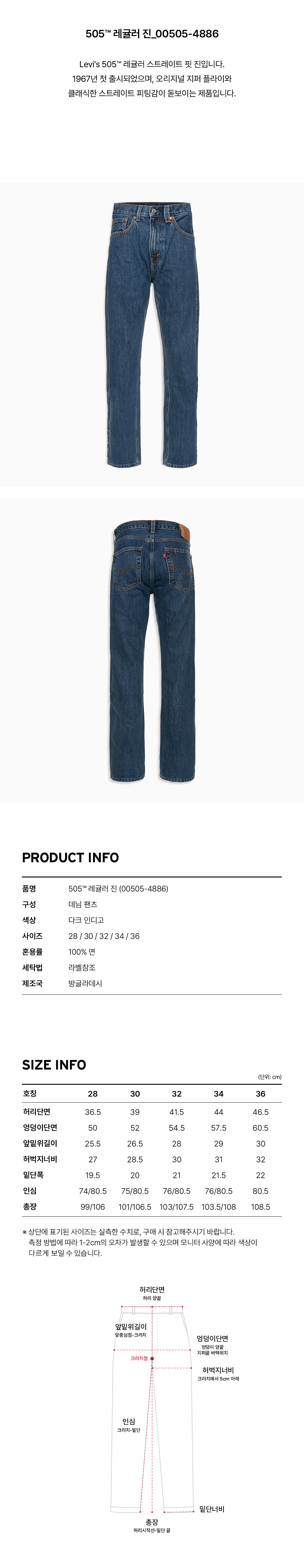 Levi's 505 레귤러 스트레이트 핏 진입니다. 1967 첫 출시되었으며, 오리지널 지퍼 플라이와 클래식한 스트레이트 피팅감이 돋보이는 제품입니다.