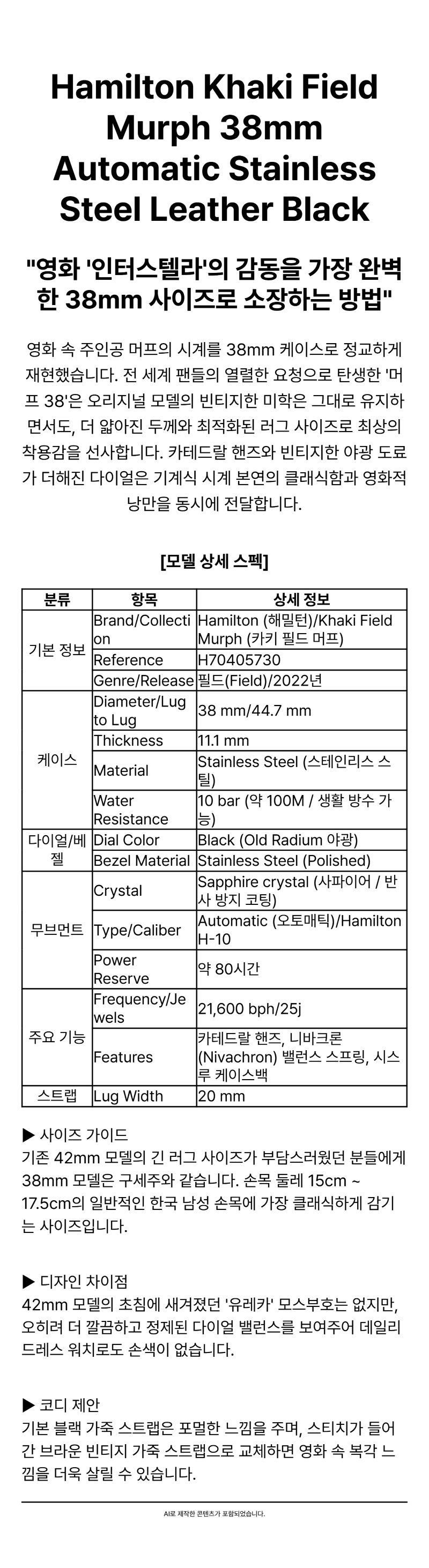 해밀턴 카키 필드 머피 38mm 오토매틱 스테인리스 스틸 레더 블랙