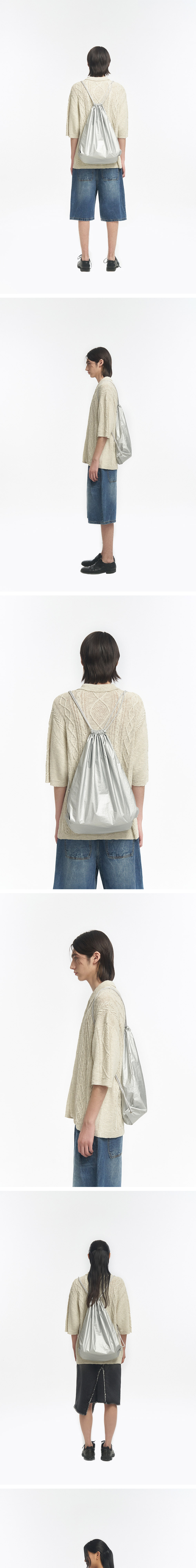 -트렌드에 맞춘 스트링 백을 자체적으로 개발 -광택감이 있는 코팅 원단 사용으로 유니크한 컬러감 표현 -글로시한 원단 사용으로 스트링 백 하나로 스타일링에 큰 포인트를 줌 -여유있는 사이즈로 일상에서 다양하게 활용이 가능 -유연하고 질긴 스트링 활용으로 내구성이 매우 우수함 -하단 끈 연결부는 금속 아일렛을 사용하여 내구성을 높임 -Model Info 남자모델(티모시): 187cm / 65kg FREE SIze 착용 여자모델(아키코): 177cm / 50kg FREE SIze 착용