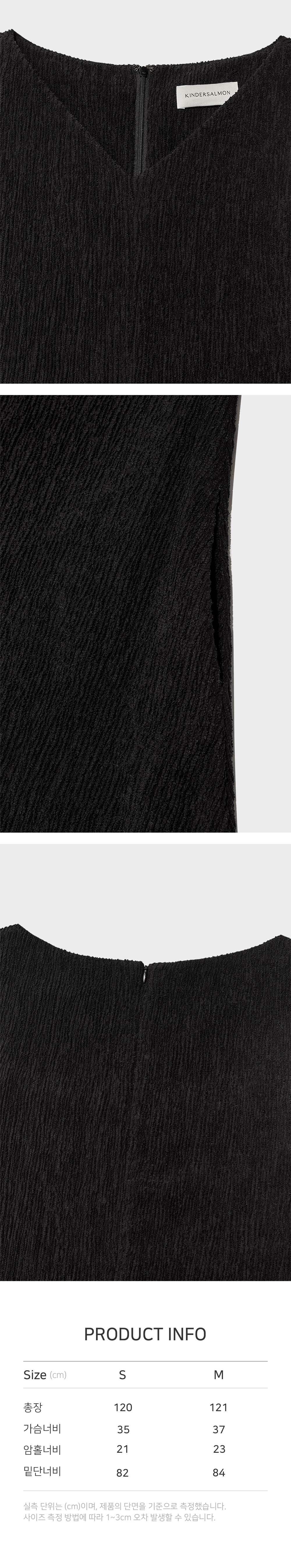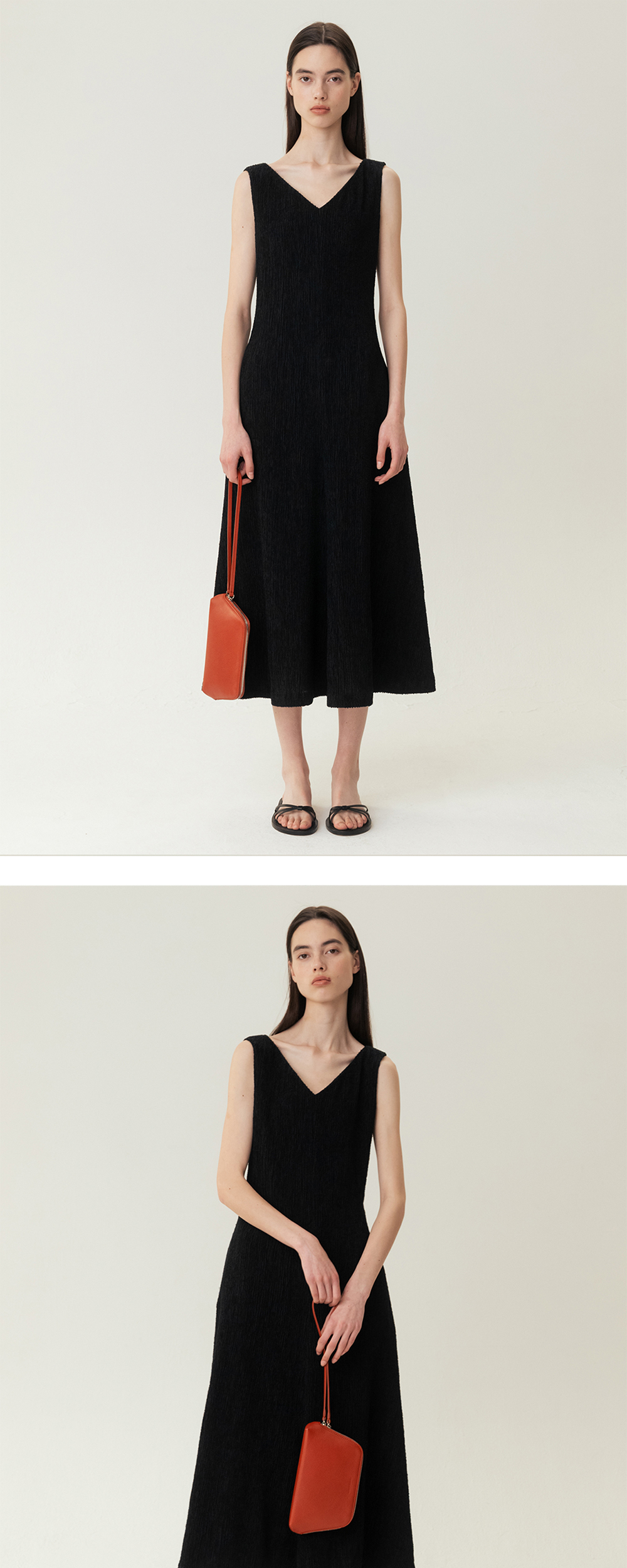 과하지 않은 브이넥라인과 자연스럽게 훌지는 실루엣이 페미닌한 슬리브리스 드레스입니다. 텍스쳐감있게 잡힌 주름이 독특한 매력을 더합니다. 일본 Stylem사의 프리미엄 원단을 사용하여 더욱 우아한 소재감을 자랑합니다.