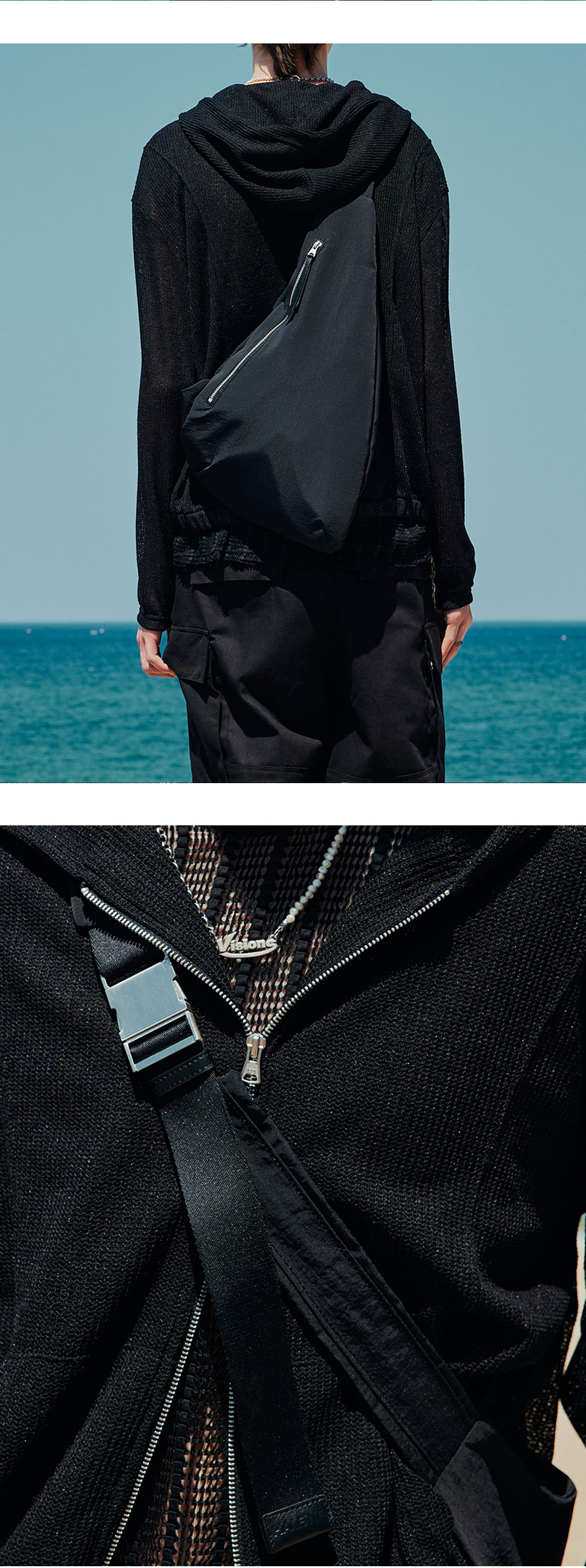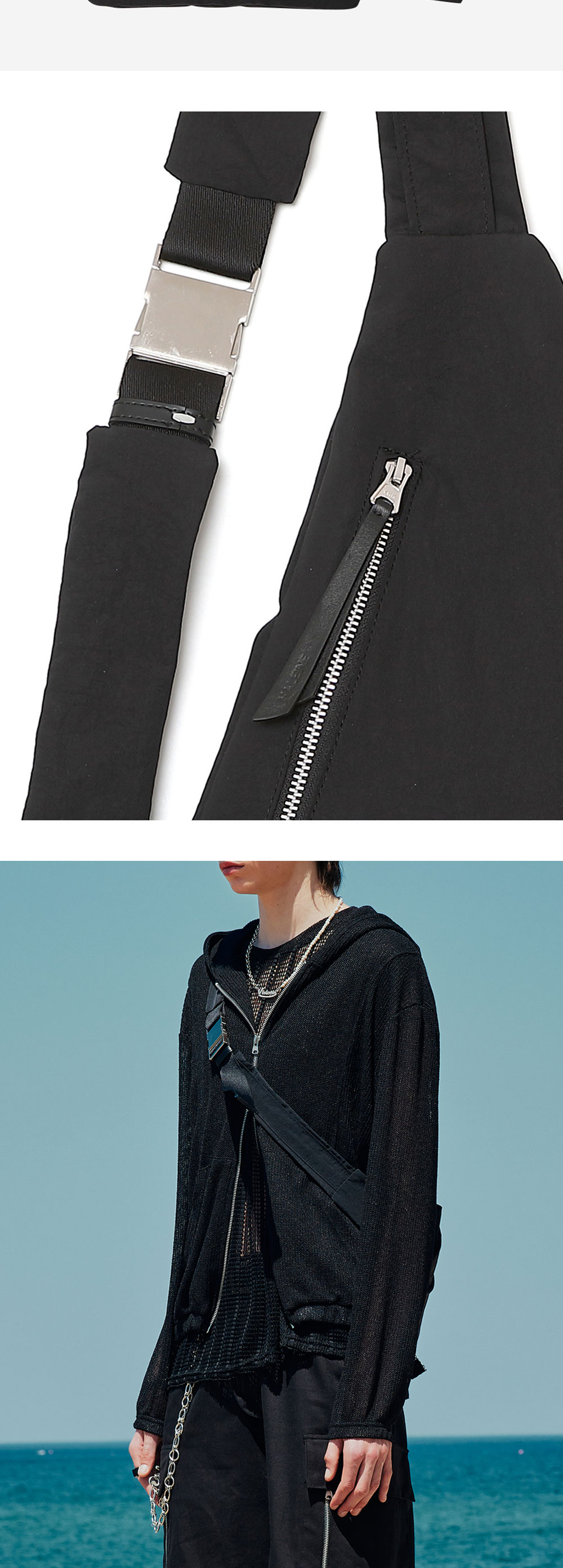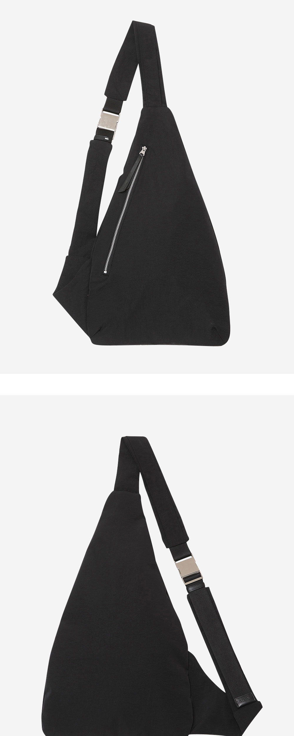 은은하게 크링클 가공된 나일론 소재로 제작된 슬링백입니다. 휴대폰/지갑/작은 소지폼 동시 수납 가능한 사이즈로 실용성도 좋습니다. -DETAIL- 1.4겹으로 끈을 입체적으로 디자인 2.나일론 끈으로 두 줄 레이어드 처리 3.스크래치 가공 처리된 볼드 한 금속 장식 4.끈 하단/벨트 고리 가죽으로 별도 제작 5.지퍼 고리 가죽으로 별도 제작