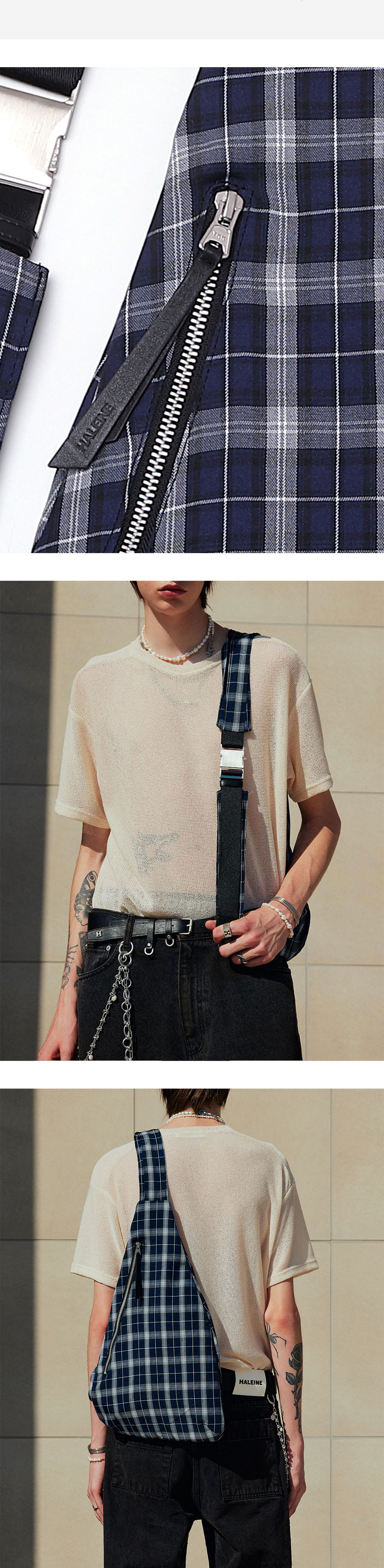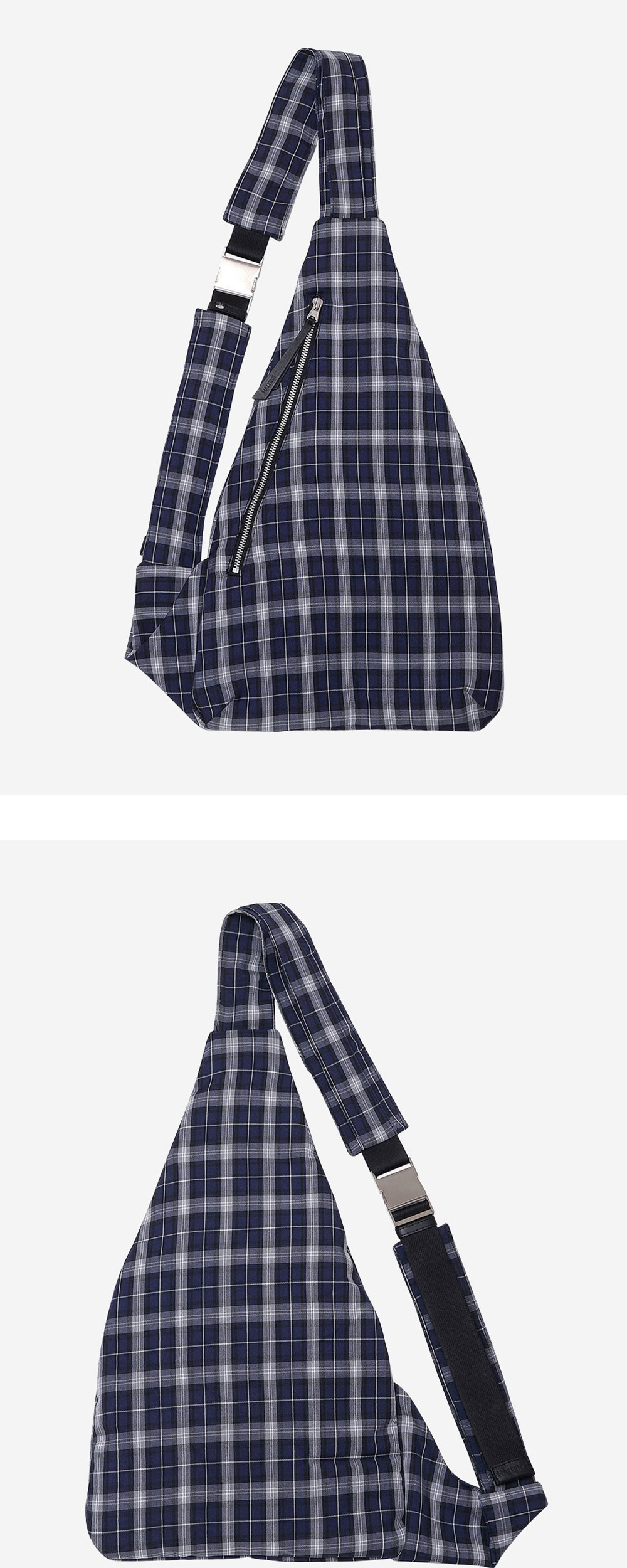 폴리에스테르 체크 소재로 제작된 소재로 제작된 슬링백입니다. 휴대폰/지갑/작은 소지폼 동시 수납 가능한 사이즈로 실용성도 좋습니다. -DETAIL- 1.4겹으로 끈을 입체적으로 디자인 2.나일론 끈으로 두 줄 레이어드 처리 3.스크래치 가공 처리된 볼드 한 금속 장식 4.끈 하단/벨트 고리 가죽으로 별도 제작 5.지퍼 고리 가죽으로 별도 제작
