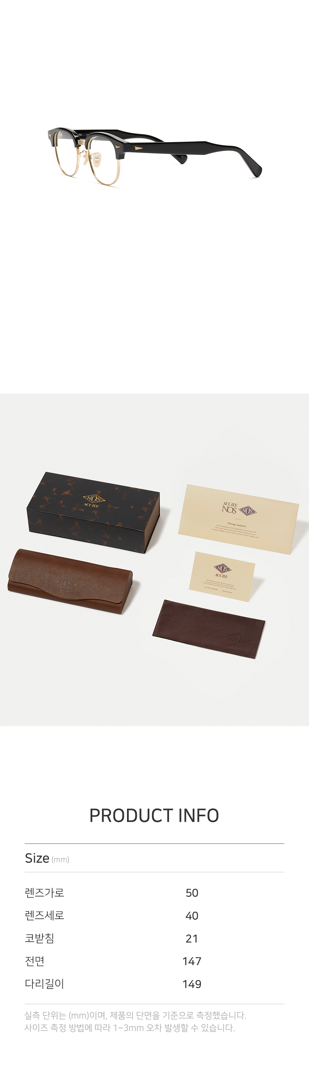 ACCRUE NOS(New old stock)는 “Vintage Inspired.” 캐치프레이즈 아래, 오랜 시간 동안 잠들어있던 과거의 오리지널리티를 그대로 재현하고, 그 속에서 새로운 가치를 창조하는 것을 목표로 합니다. NOS-04는 클래식한 아메리칸 하금테 스타일을 오마주한 프레임입니다.