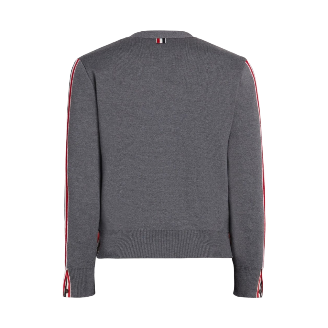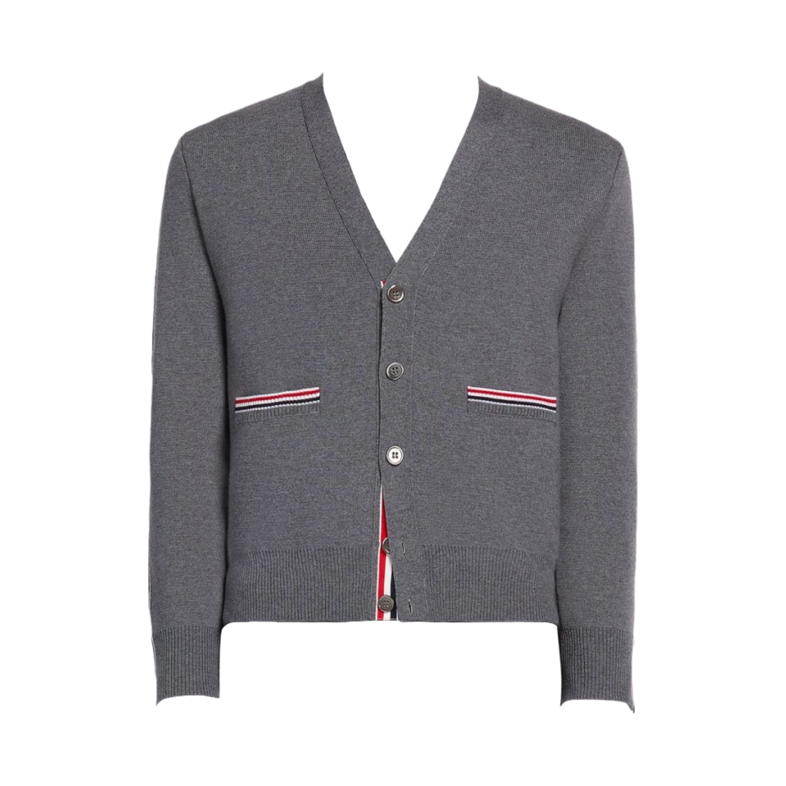 Thom Browne Fine Merino Wool Intarsia Stripe Milano Stitch V-Neck Cardigan Grey