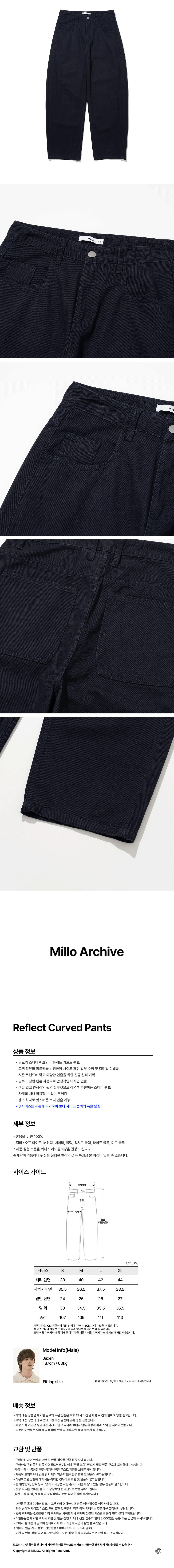 -밀로의 스테디 팬츠인 리플렉트 커브드 팬츠 -고객 리뷰와 피드백을 반영하여 사이즈 패턴 일부 수정 및 디테일 디벨롭 -시즌 트렌드에 맞고 다양한 연출을 위한 신규 컬러 기획 -금속 고정형 캔톤 사용으로 안정적인 디자인 연출 -여유 있고 안정적인 핏의 실루엣으로 강력히 추천하는 스테디 팬츠 -사계절 내내 착용할 수 있는 두께감 -팬츠 하나로 멋스러운 코디 연출 가능 -모델 스펙 남자 (잭슨) 187cm/ 60kg 피팅 사이즈 L