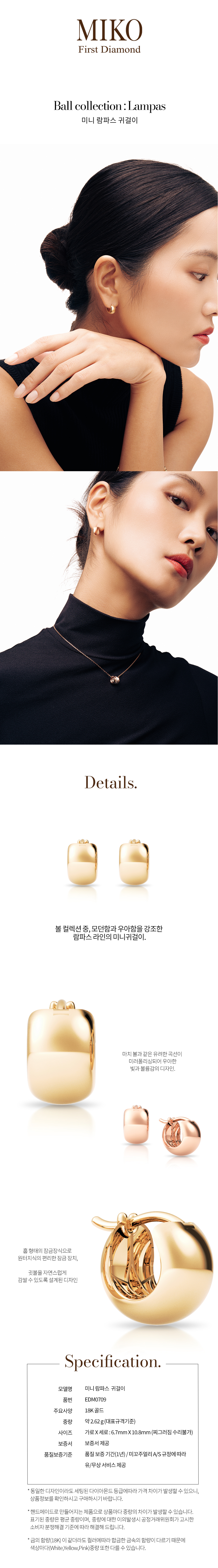 해당 상품 구입시 제작 및 출고에 영업일 기준 최대 14일이 소요됩니다. 언제나, 어디서나 동일한 가치를 인정받는 최상의 스톤만을 셀렉합니다. 미꼬의 스톤 전문가는 뉴욕, 홍콩, 인도, 일본, 벨기에 등 세계 각지에서 매일 소통하며 다이아몬드를 비롯한 스톤을 선택합니다. 3부이상 : GIA 다이아몬드 Only. 3부미만 : G/VS2/VG(별도표기 없을 시 기본등급) H/SI2/VG(일부 온라인 익스클루시브 제품, 제품명에 SI2 표기) 미꼬는 100% 핸드메이드로 외주공정이 아닌 독자적인 장인들의 공정운영으로 고객 한 분 만을 위한 주얼리입니다. 재고상품을 판매하는 것이 아닌 최상의 퀄리티를 가진 오더메이드 파인주얼리를 재공하고자하는 미꼬의 브랜드 규정입니다. 크림에서 판매되는 미꼬의 모든 주얼리는 18k Gold로 제작된 핸드메이드 파인주얼리입니다.