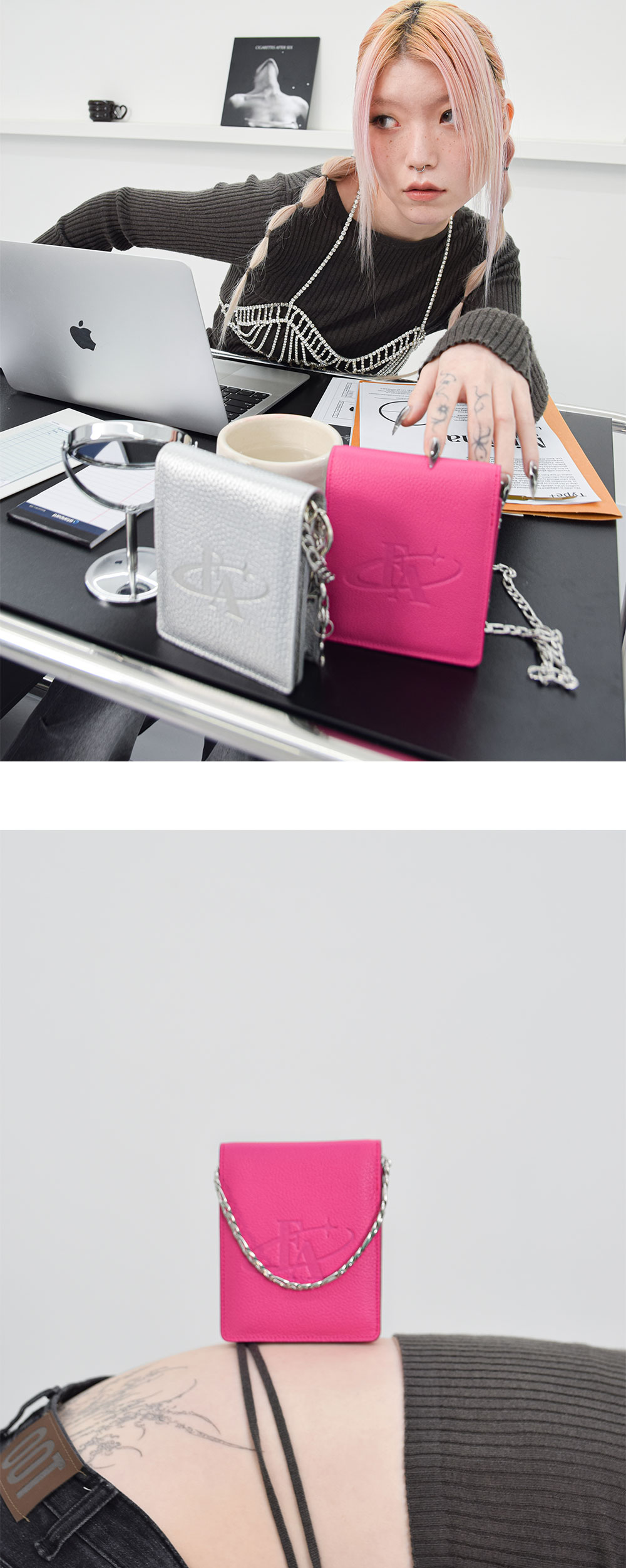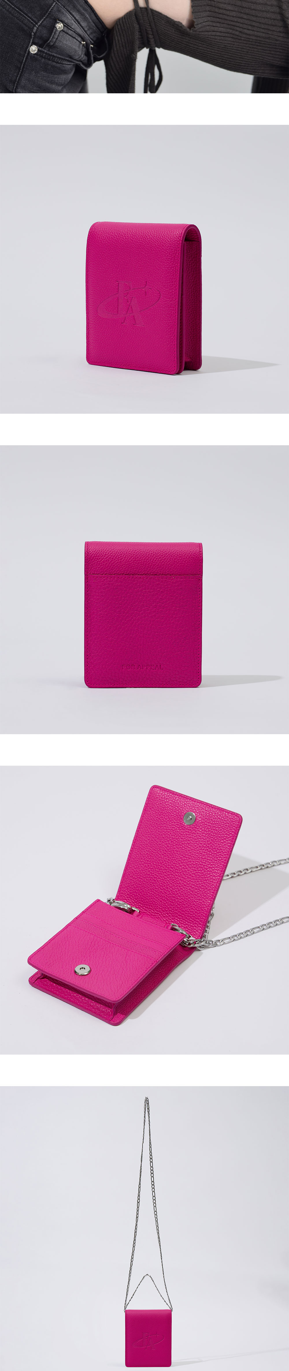 포어필의 시그니처 라인 시가렛 월렛 백 입니다. 가방의 사이즈를 최소화 시켜 간편함을 극대화 시킨 것이 특징입니다. 하이퀄리티의 스몰 패블가죽으로 자연스러운 광도와 불규칙한 패턴으로 한층 고급스러운 질감을 표현하였습니다. 두가지 기장의 써지컬스틸 체인 스트랩이 제공됩니다.작은 소지품을 담기 좋은 제품이며 별도의 카드 칸이 있어 자주 쓰는 카드 등의 수납이 용이합니다. 강한 내구성, 알러지 없음, 고급스러운 질감과 고유의 광택이 처음과 같이 오래도록 유지되는 것이 써지컬 체인의 장점입니다.