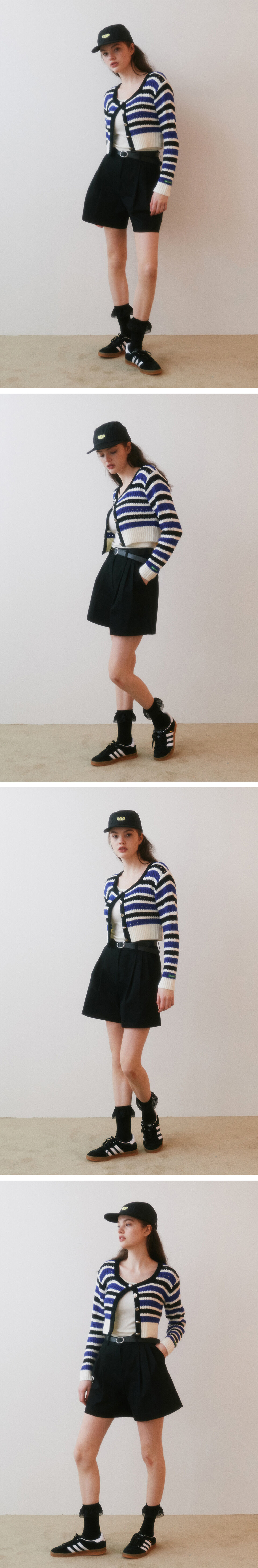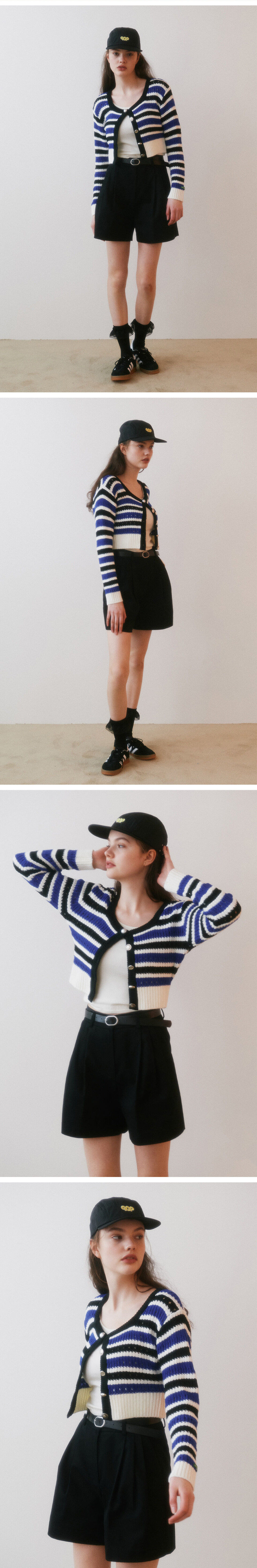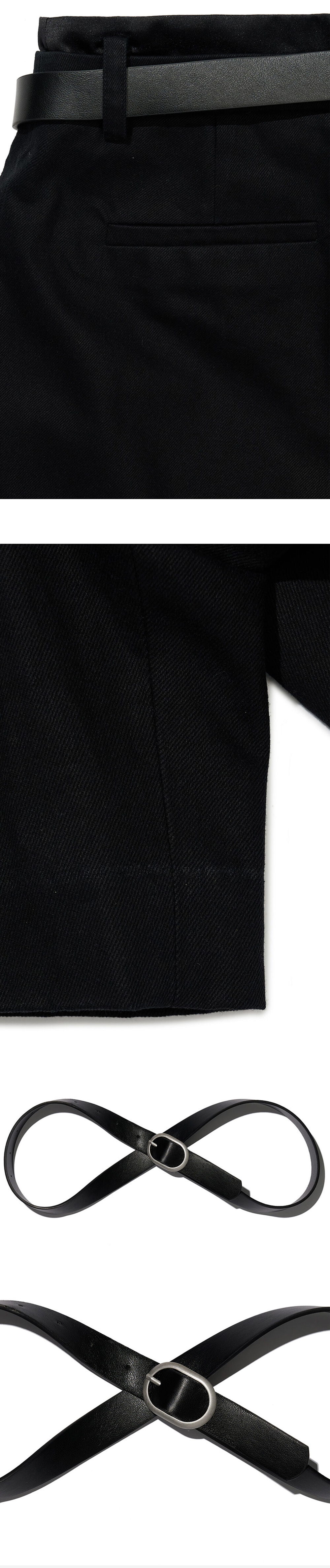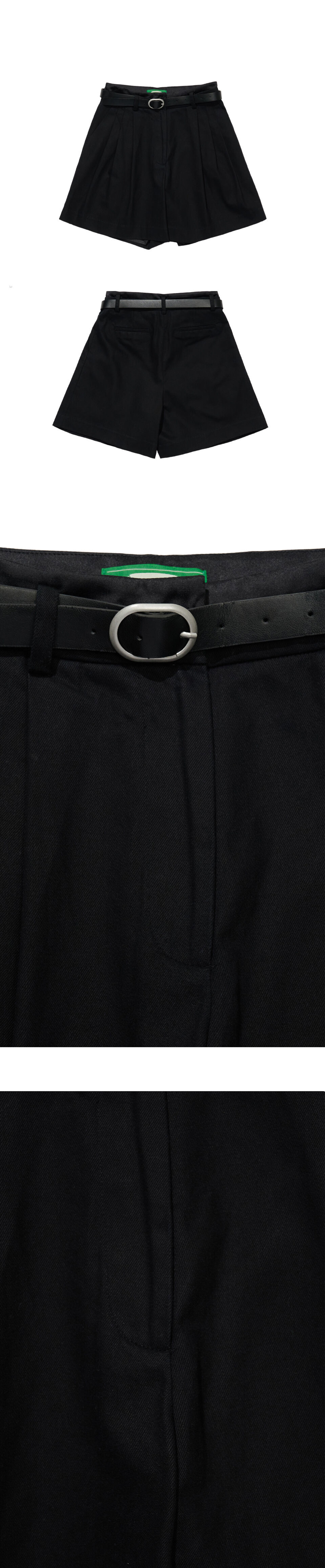 이중으로 이루어진 허리선이 특징인 반바지제품으로, 벨트와 함께 구성되어 있습니다. 허리의 핀턱선으로 더욱 완벽한 A라인형태의 쉐잎을 완성했고, 면 10수 원단을 사용해 사계절활용도가 높은 제품입니다.