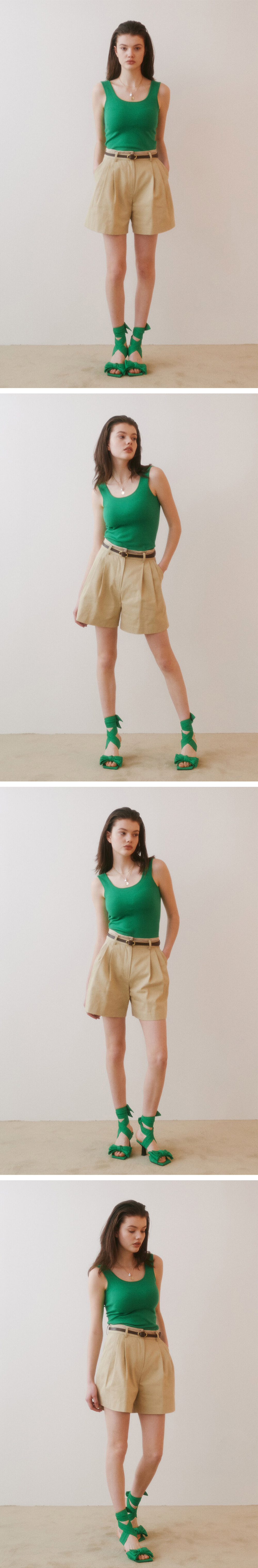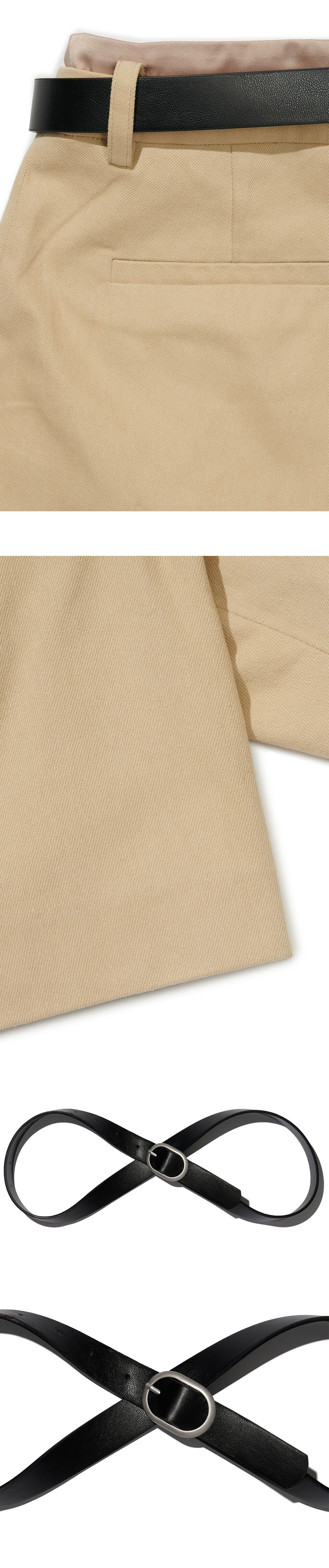 이중으로 이루어진 허리선이 특징인 반바지제품으로, 벨트와 함께 구성되어 있습니다. 허리의 핀턱선으로 더욱 완벽한 A라인형태의 쉐잎을 완성했고, 면 10수 원단을 사용해 사계절활용도가 높은 제품입니다.