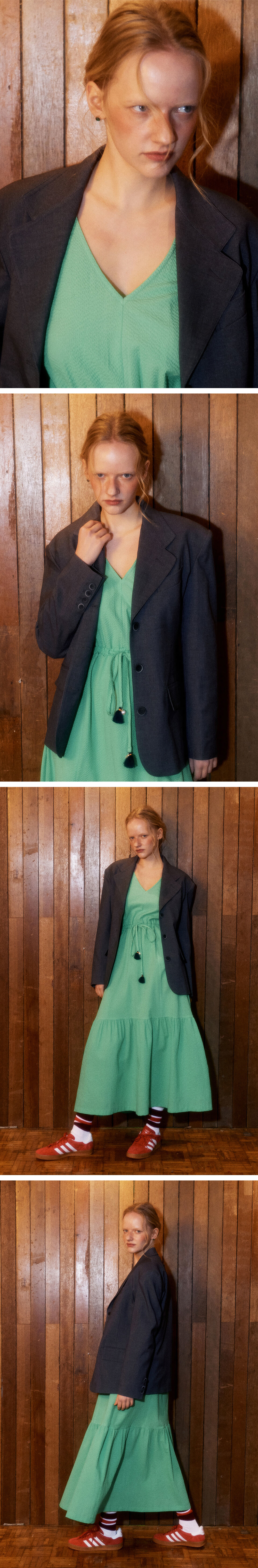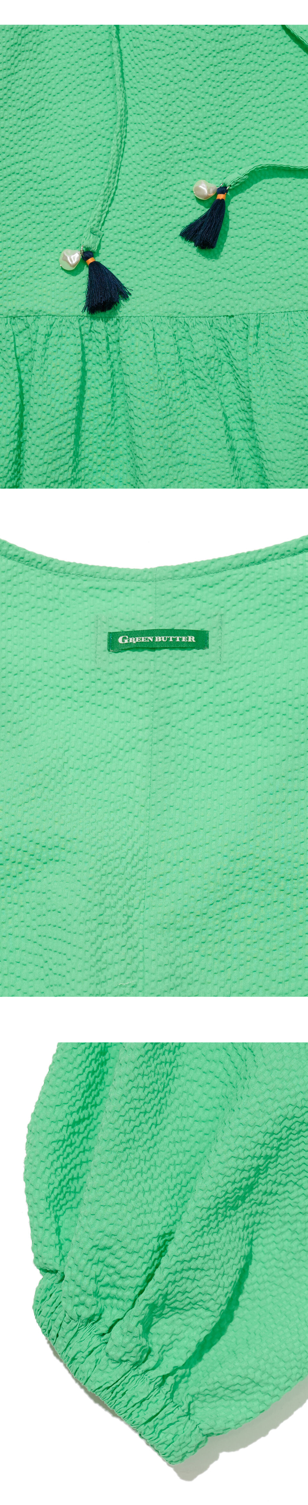 면100% 시어서커원단을 사용한 원피스입니다. 사이즈 조절 가능한 허리끈끝에 태슬과, 불규칙한 담수진주비즈를 함께 달아 포인트를 주었습니다. 소매밑단에 밴드를 넣어 활동성이 좋고, 여유로운 품으로 편안한 착용감의 제품입니다. 뒷목 아래로 그린버터의 초록색라벨을 부착해 포인트를 주었습니다.