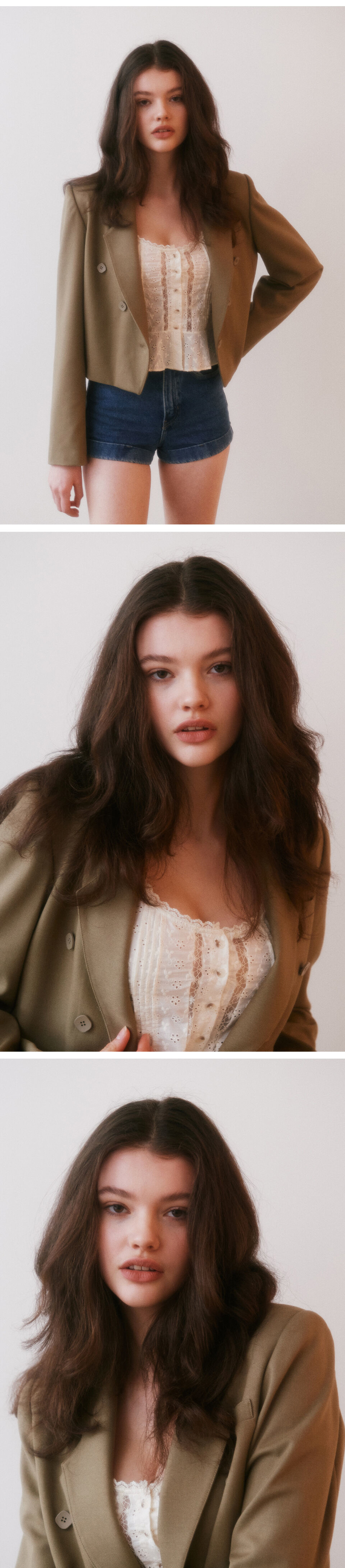 살짝 여유있는 어깨품의 디자인으로, 어깨패드를 넣어 어깨를 쳐지지않도록 했습니다. 브이형태로 떨어어지는 밑단이 포인트이며, 단추는 네모형태로 심플하지만 키치한 무드로 표현했습니다. 찰랑거리는 듯 부드러운 터치감이지만 탄탄한 원단을 채용해 어깨에서 소매로 이어지는 실루엣을 신경쓴 디자인입니다.