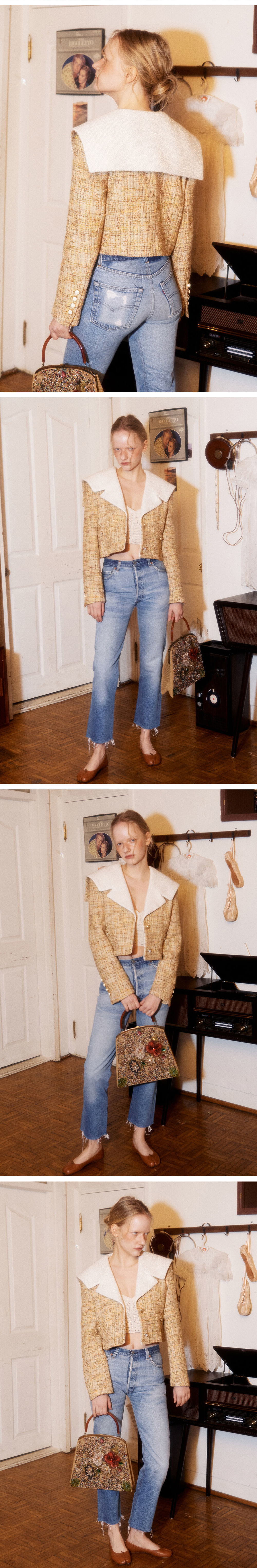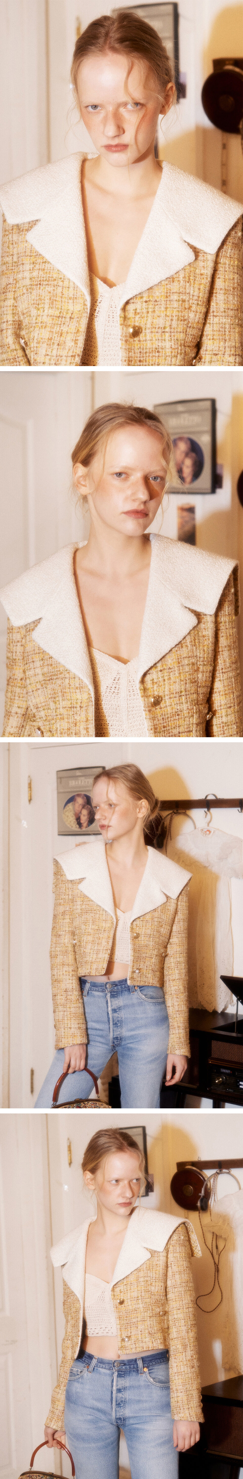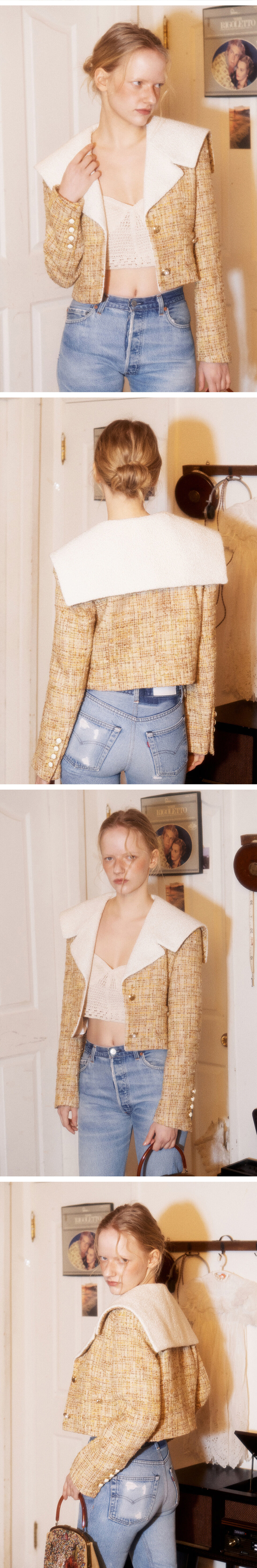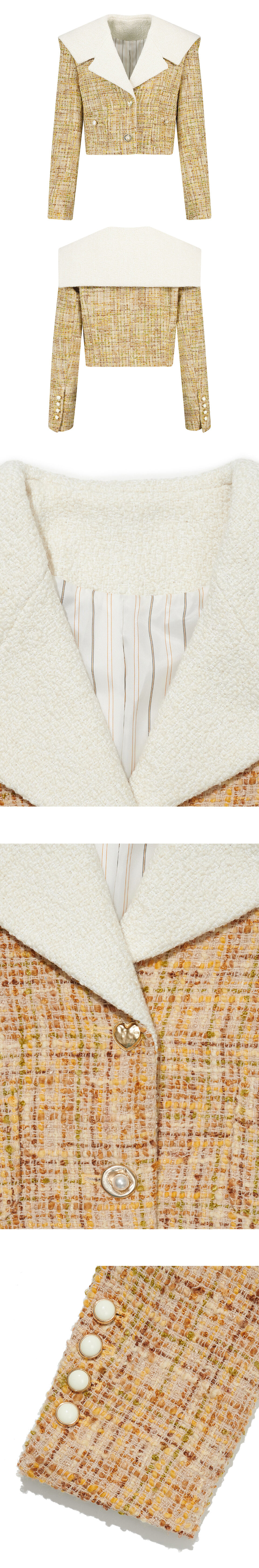 세일러형태의 빅 카라디자인으로 카라는 부클원단으로 이루어져있고, 안감은 톤 앤 톤의 스트라이프를 채용해 완성도가 높은 자켓입니다. 하트와, 진주 등 골드톤의 모두 다른모양의 단추를 포인트로 달아 그린버터만의 무드가 돋보이는 제품입니다.