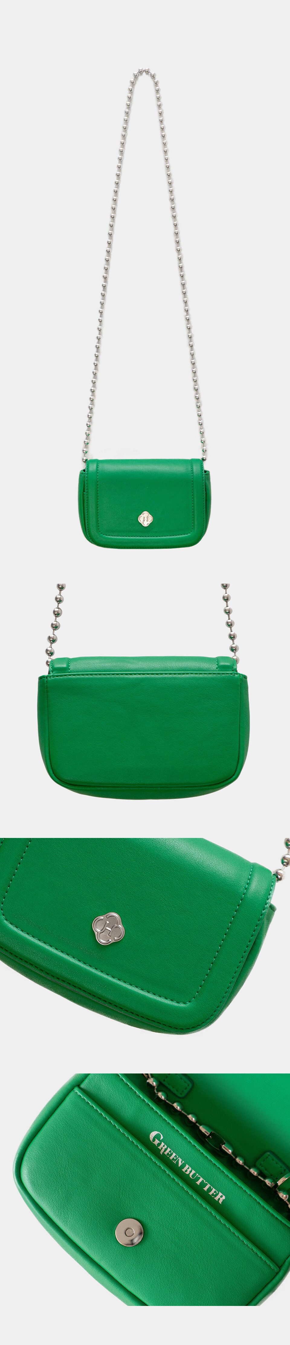플랩 디자인의 귀여운 체인 미니백입니다. 은은한 광택의 크랙 레더 소재가 히어리의 시그니처 장식과 그린버터만의 컬러감이 더해져 빈티지한 무드를 자아냅니다. 서지컬스틸 소재의 체인 스트랩은 사틴 가공되어 내구성이 좋고 변색이 없어 관리가 용이합니다. 스트랩은 크로스와 탑핸들, 두 가지 방식으로 활용이 가능합니다. 내부는 실버 컬러의 그린버터 로고로 포인트를 주었으며, 히어리 시그니처 옐로우 컬러의 안감에 메인 수납칸, 카드 수납칸으로 구성되어 핸드폰 및 카드지갑을 넉넉하게 수납할 수 있습니다.