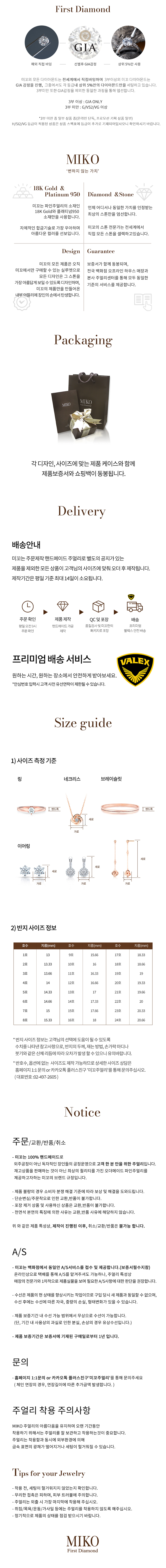 해당 상품 구입시 제작 및 출고에 영업일 기준 최대 14일이 소요됩니다. 언제나, 어디서나 동일한 가치를 인정받는 최상의 스톤만을 셀렉합니다. 미꼬의 스톤 전문가는 뉴욕, 홍콩, 인도, 일본, 벨기에 등 세계 각지에서 매일 소통하며 다이아몬드를 비롯한 스톤을 선택합니다. 3부이상 : GIA 다이아몬드 Only. 3부미만 : G/VS2/VG(별도표기 없을 시 기본등급) H/SI2/VG(일부 온라인 익스클루시브 제품, 제품명에 SI2 표기) 미꼬는 100% 핸드메이드로 외주공정이 아닌 독자적인 장인들의 공정운영으로 고객 한 분 만을 위한 주얼리입니다. 재고상품을 판매하는 것이 아닌 최상의 퀄리티를 가진 오더메이드 파인주얼리를 재공하고자하는 미꼬의 브랜드 규정입니다. 크림에서 판매되는 미꼬의 모든 주얼리는 18k Gold로 제작된 핸드메이드 파인주얼리입니다.
