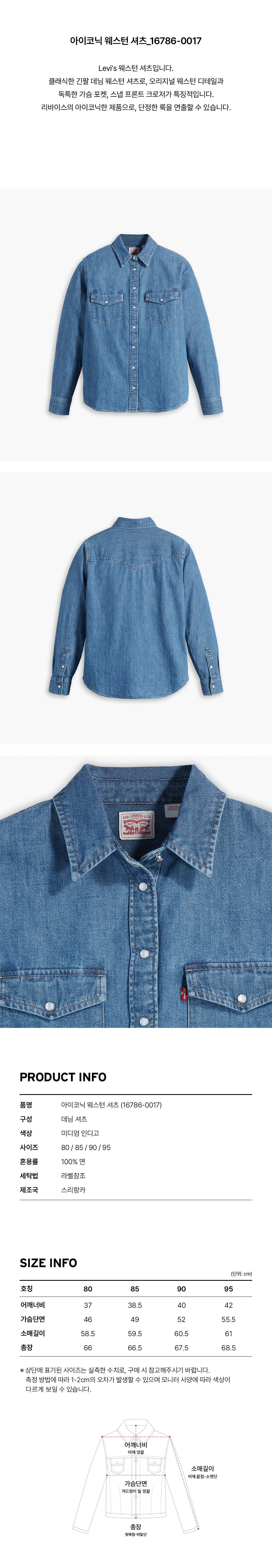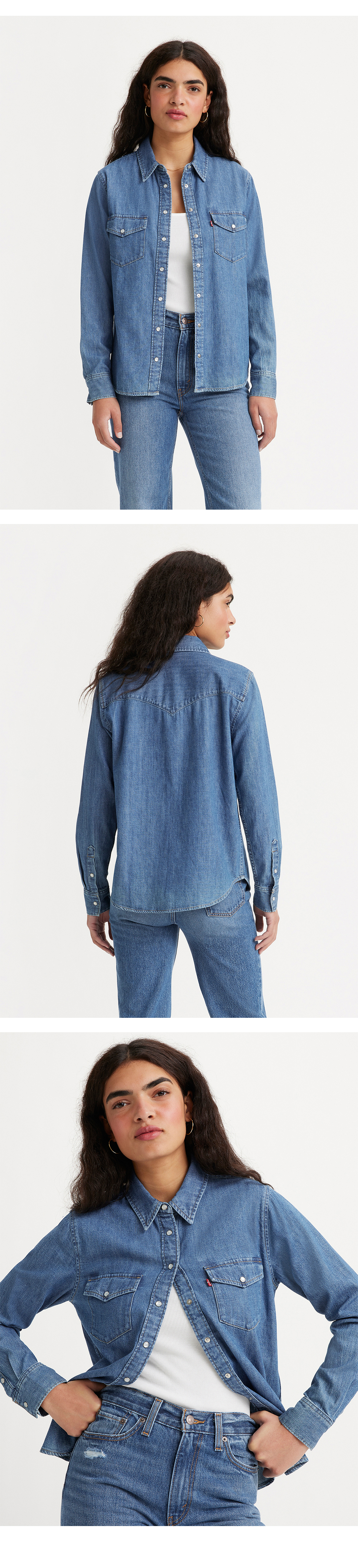 Levi's 웨스턴 셔츠입니다. 클래식한 긴팔 데님 웨스턴 셔츠로, 오리지널 웨스턴 디테일과 독특한 가슴 포켓, 스냅 프론트 크로저가 특징적입니다. 리바이스의 아이코닉한 제품으로, 단정한 룩을 연출할 수 있습니다.