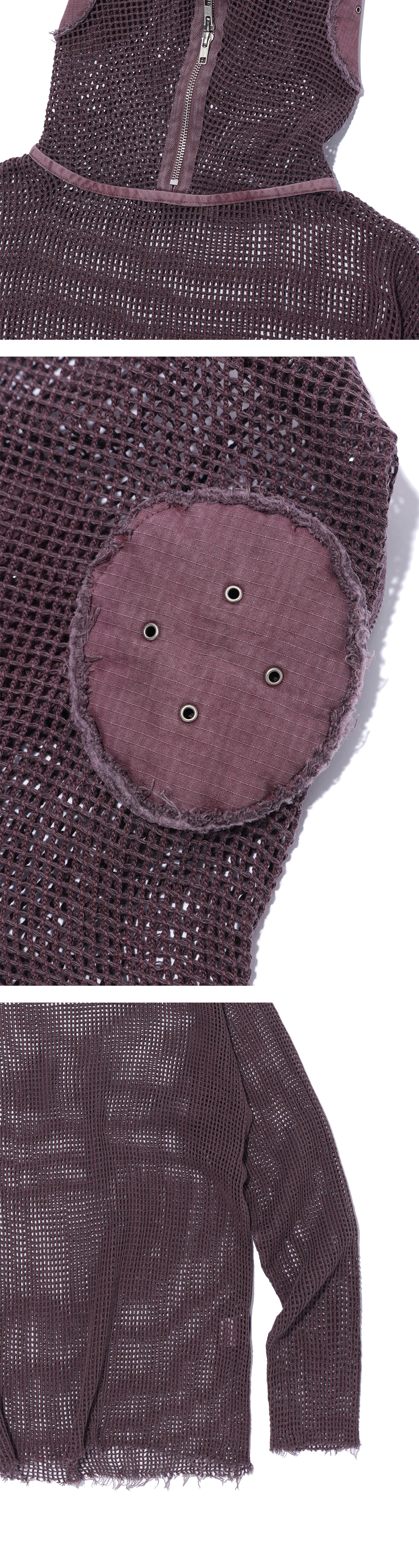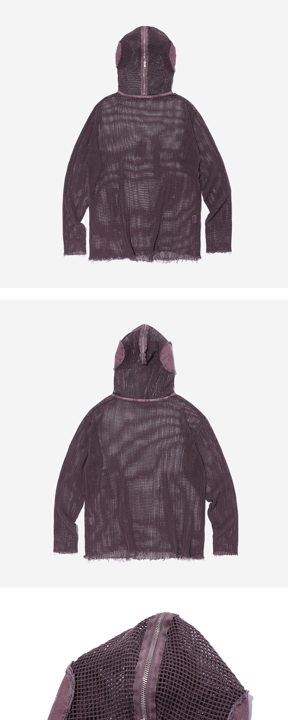 피그먼트 워시드 가공된 그물 소재 YKK 투웨이 지퍼 밑단 로우컷 디테일