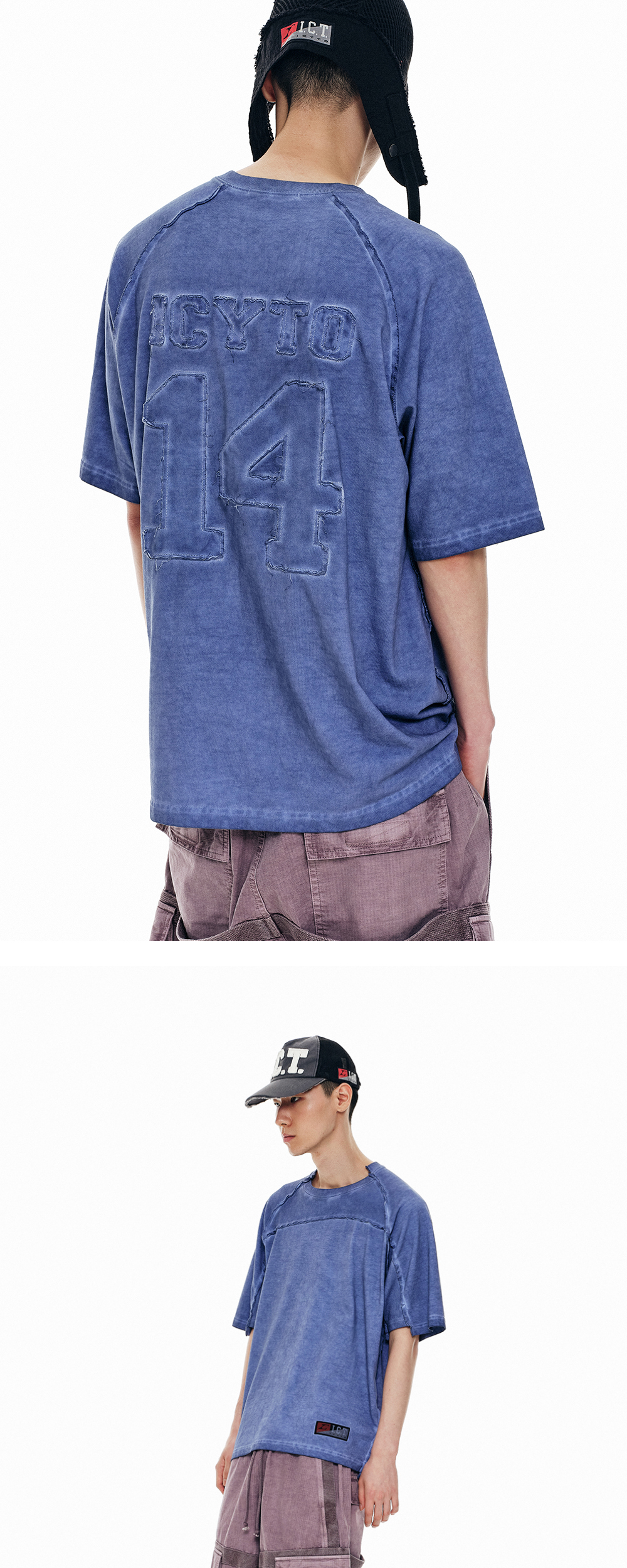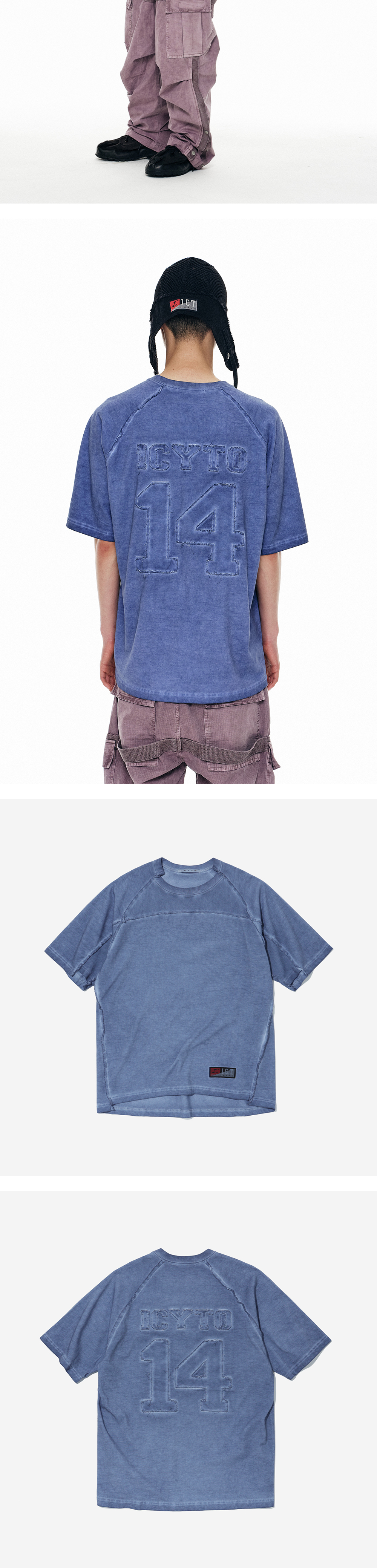 로우컷 래그런 티셔츠 피그먼트 염색 전면 하단 ICT스포츠 라벨 후면 로고 아플리케 자수