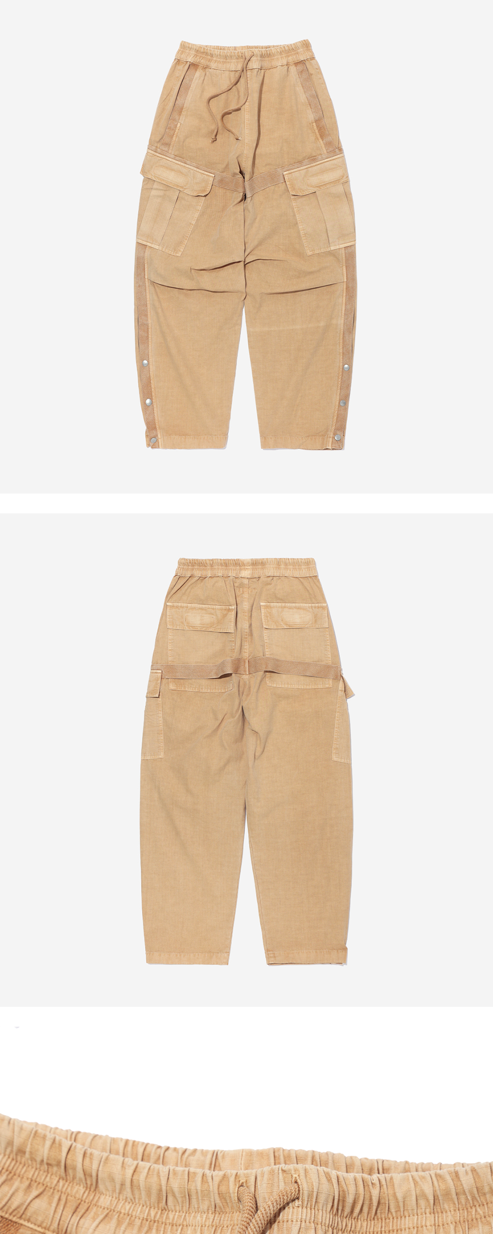 스트랩 디테일의 카고 팬츠 피그먼트 염색 4개의 카고 포켓 밑단 너비 조절 스냅 버튼
