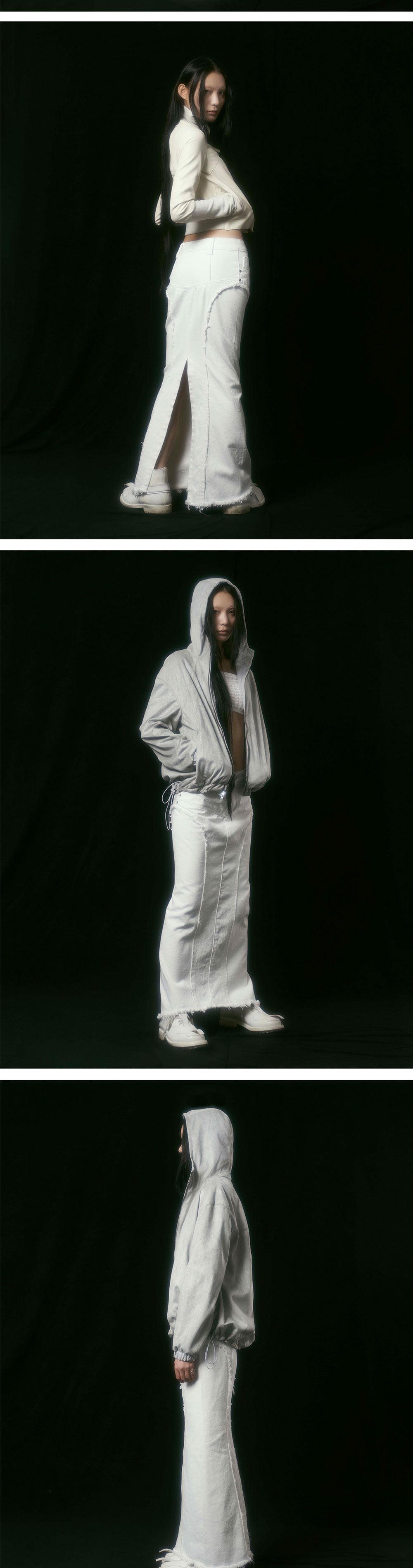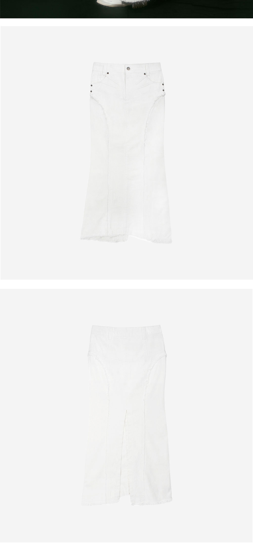 앞 다트 디테일 뒤 트임 비대칭 컷 아웃 디테일 자연스러운 올 풀림 바이오 워싱 이염 주의 Size(Length/Waist/Hip/Hem) 1 : 94cm/35.5cm/43cm/45cm 2 : 99cm/39.5cm/47cm/49cm Cotton 100%