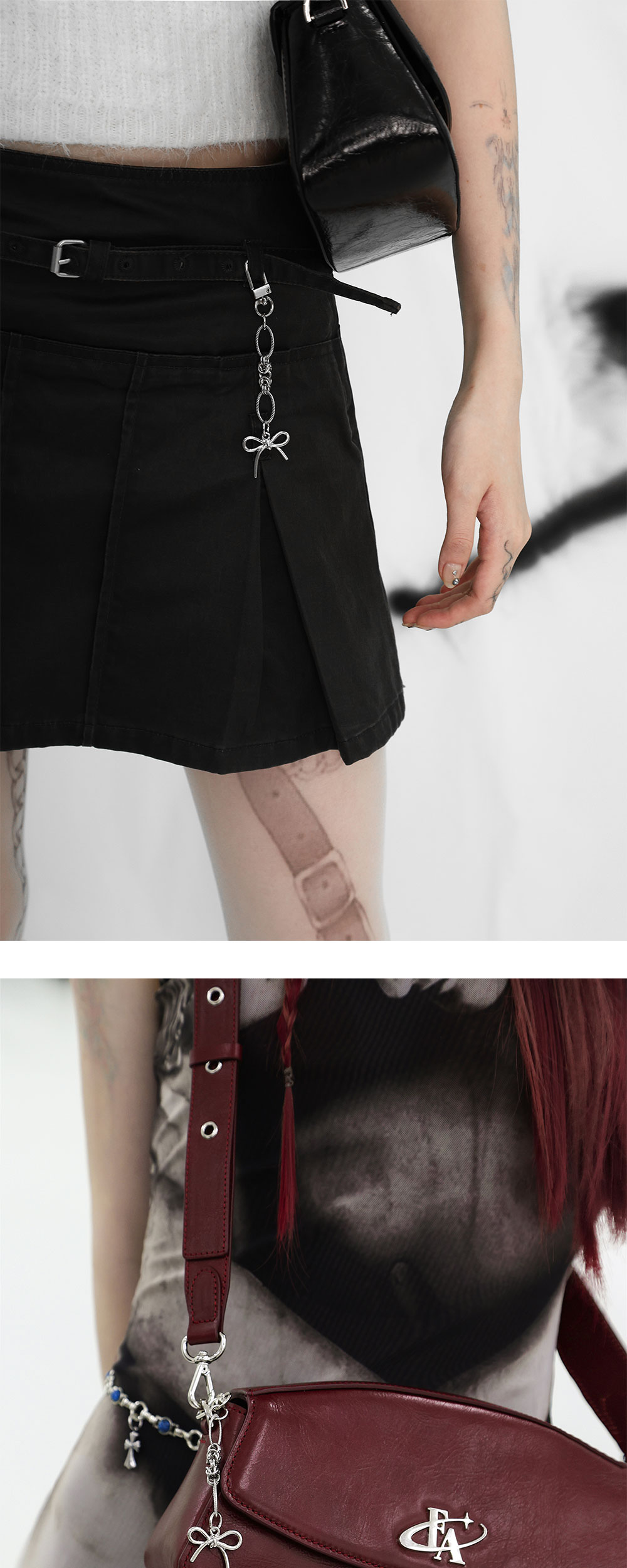 Chain: surgical steel Buckle: nickel Pendant: nickel 리본 팬던트와 체인을 레이어드하여 제작된 키치한 무드의 키링 가방, 지갑, 팬츠, 등 원하는 곳에 매치하여 포인트 주기 좋은 아이템