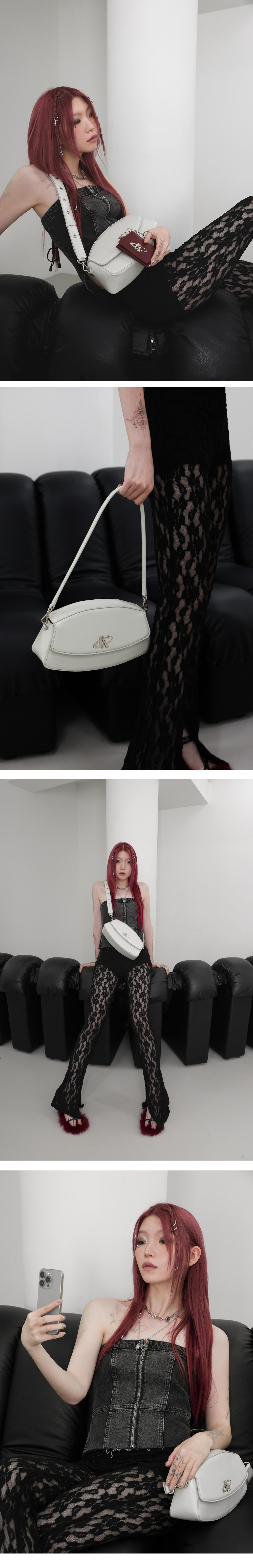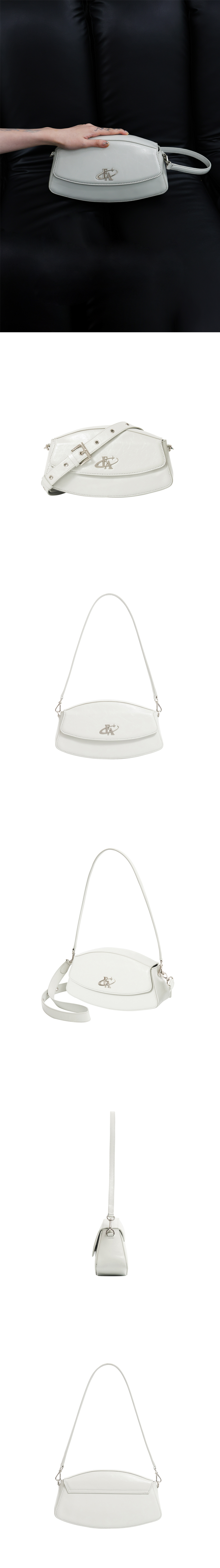 Outside : Cow-Leather Inside :Polyester Strap: Cow-Leather Pendant :Nickel 럭비공 모양의 유선형 디자인 볼드한 로고 팬던트, 스트랩 아일렛이 포인트 마그네틱 오픈-클로징으로 안전한 수납 가능 클러치,숄더,크로스 3way