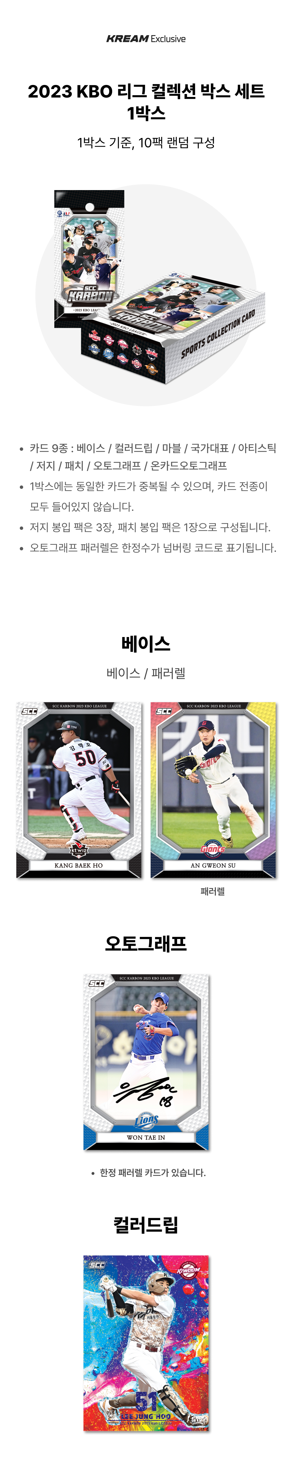 - 본 상품은 KBO 야구카드 컬렉션입니다 - 박스 별로 카드가 랜덤 구성되어 있으며, 일반적으로 5장의 카드가 랜덤 동봉된 팩이 10개 들어있습니다. 유니폼 조각 카드가 동봉되어 있는 팩의 경우 카드의 두께에 따라 1장 혹은 3장의 카드가 동봉되어 있을 수 있습니다 - 박스 당 사인카드 2장 혹은 사인카드1장, 유니폼 조각 카드 1개가 보장됩니다 - 모든 카드 제품은 랜덤 구성으로 특정 카드가 나오지 않을 수 있습니다 - 박스의 포장 비닐이 뜯어지거나 데미지가 있을 경우 상품 환불이 불가합니다
