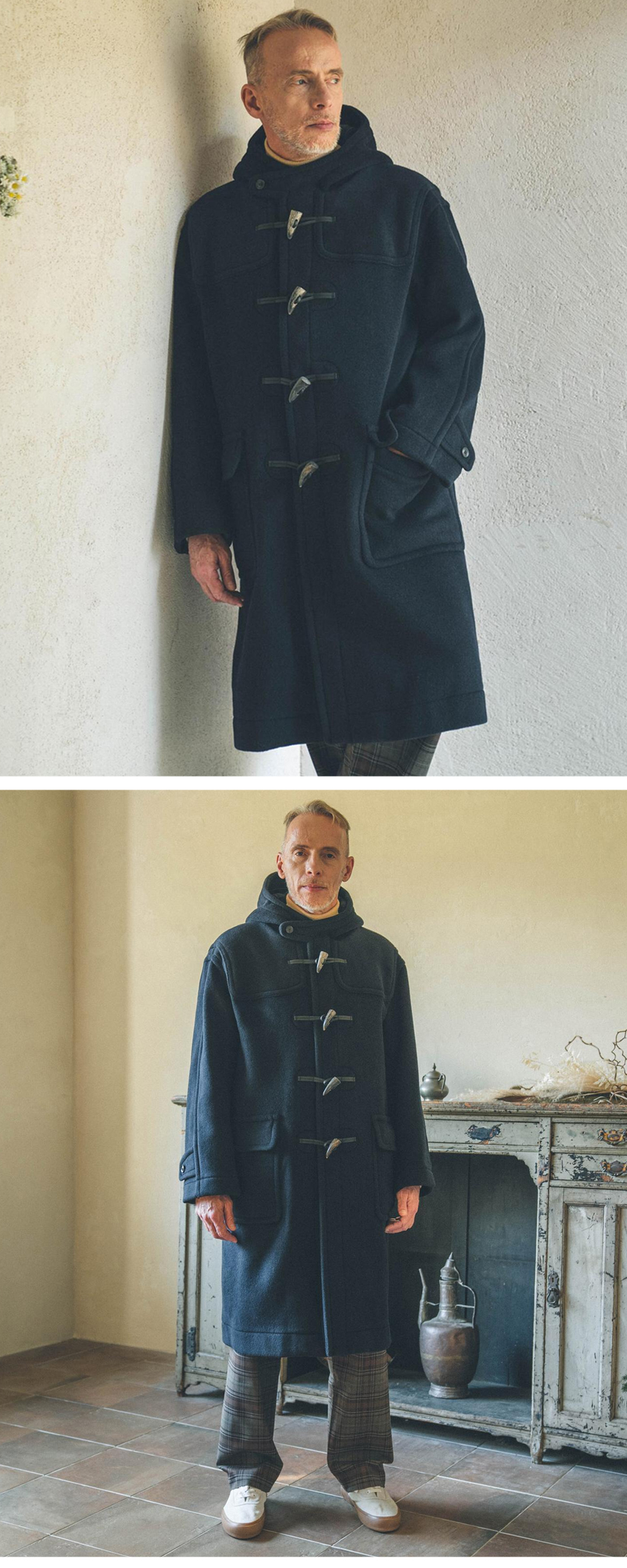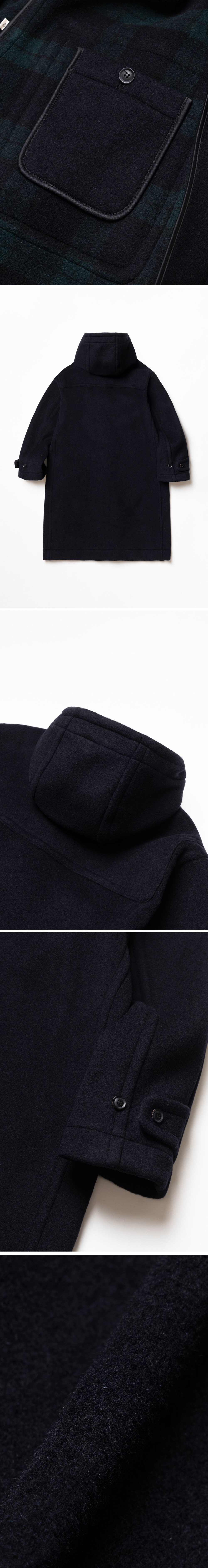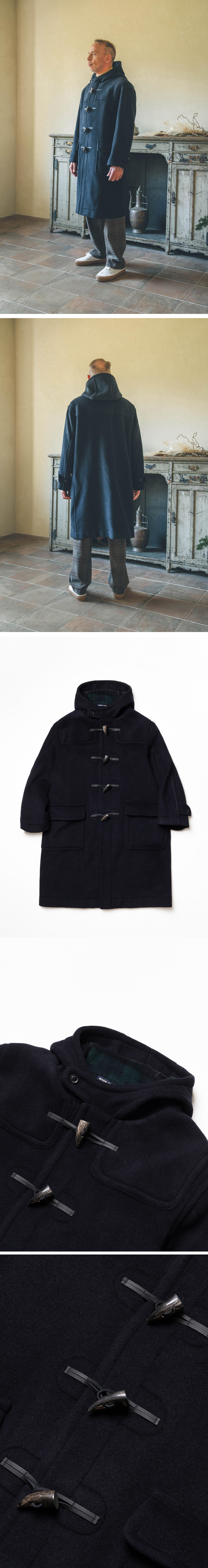 LONDON TRADITION Milford Mens Oversize Duffle Coat Navy BW 28 런던 트레디션 밀포드 맨즈 오버사이즈 더플 코트 네이비 BW 28 후드 스트랩과 둥근 요크 디테일이 돋보이는 밀포드 오버사이즈 더플 코트 가죽과 소뿔 버튼 사용 소매 스트랩 디테일 더블 페이스의 이탈리아 수입 원단 사용 유니크한 안쪽 체크 패턴 오버사이즈 실루엣