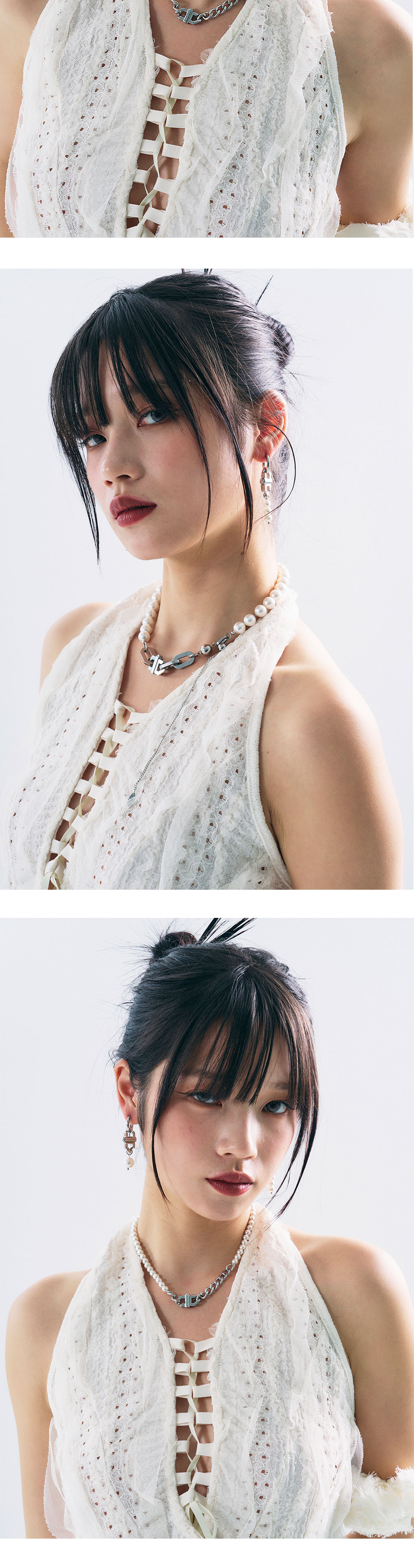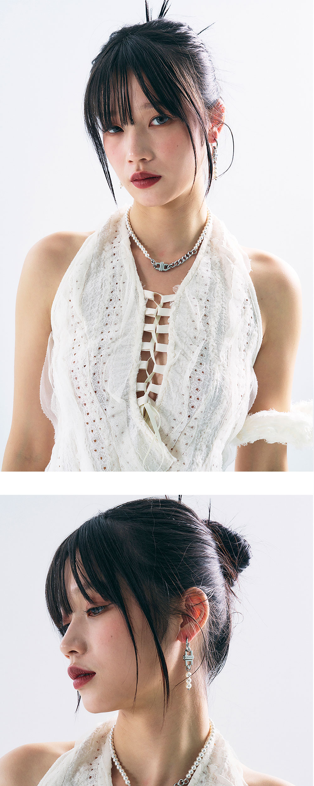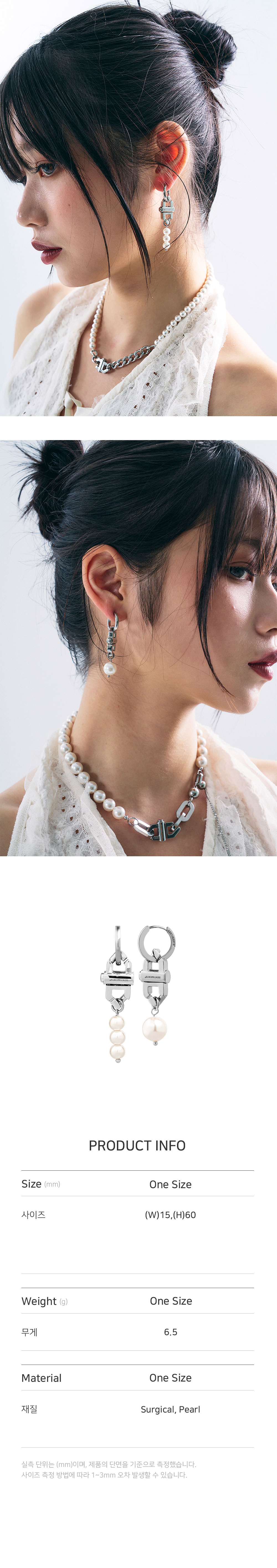 • 길이: W 1.5CM X H 6CM • 무게(WEIGHT): 6.5G • 언밸런스 타입 이어링 • 누름 버튼으로 장식 분리 가능 • 원터치 이어링 • 제조국: 대한민국 • 부드러운 천으로 닦아 관리 • 소재: 써지컬(SURGICAL) 80% 핵진주(PEARL) 20%