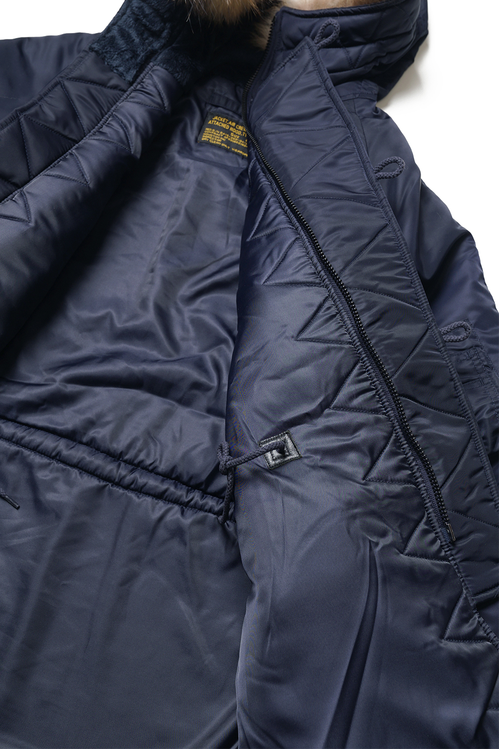 Houston Japan 50317 N-3B Flight Jacket - Navy 혹한지에서의 지상 근무용으로 제작된 N-3B 자켓입니다. 추위에 대응할수 있도록 충전재를 가득 넣어 두툼하게 제작되었습니다. 후드에는 리얼 라쿤퍼를 사용하였으며, 후드의 안감은 보아를 사용하여 보온성에 뛰어 납니다. 프론트 부분에는 가죽 핸들이 위치해 있으며, IEDAL社의 지퍼와 버튼을 사용하였습니다. 프론트 양측으로 스냅버튼이 달린 포켓이 위치해있으며, 왼쪽 가슴 부분에는 박스탭이 디자인 되어 있습니다. 허리 부분에는 드로우 코드로 사이즈 조절이 가능합니다. 양 팔꿈치 부분은 마모를 방지하기 위해 엘보우 패치가 장착되어 있습니다. 왼팔에는 유틸리티 포켓이 있으며, 소맷단은 바람의 침입을 막아줍니다.