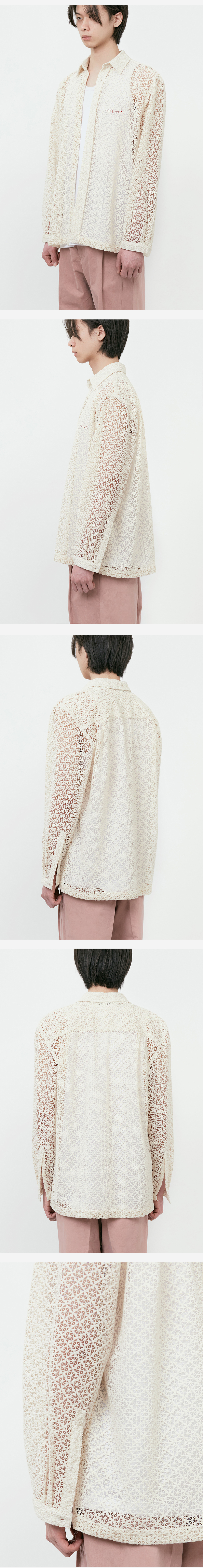*봄, 여름 시즌에 착용하기 좋은 아이보리 컬러의 코스모스 크로셰 셔츠 *고밀도의 COTTON 100 면사와 높은 기술력으로 제직된 크로셰 원단 *카라 및 커프스에는 심지를 부착해 내구성 높임 *낙낙한 실루엣