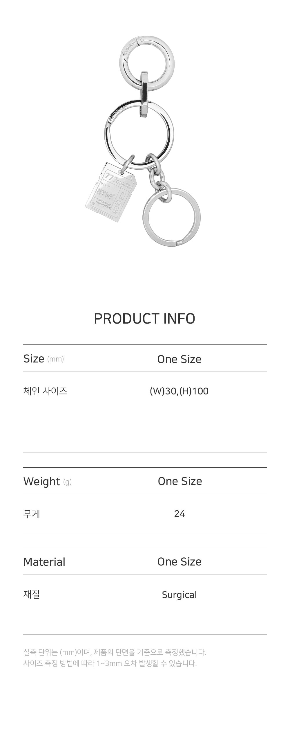 • 크기: 가로(W) 3CM X 세로(H) 10CM • 무게(WEIGHT): 24G • STM SD CARD 펜던트 • 제조국: 대한민국 • 부드러운 천으로 닦아 관리 소재: 써지컬(SURGICAL) 100%