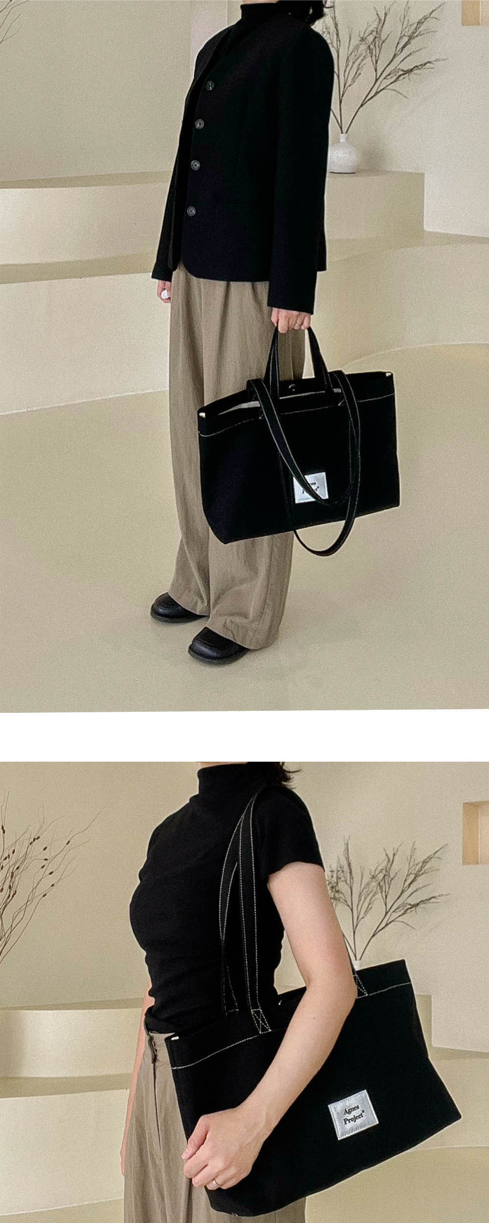 Peanut Multi Bag _ Black (피넛 멀티백_블랙) 학생도, 직장인도, 육아 메이트도, 근교 여행갈때도, 고객님들의 다양한 니즈를 반영하여 제작된 피넛 멀티백. 가볍고 편안해 매일매일 손이 갈거예요. [Shape] 바디 쉐입은 가로 형태로 디자인되어 많은 짐을 넣어도 안정감있게 뛰어난 수납력을 자랑하고, 두껍지도 얇지도 않은 숄더끈이 있어 어깨에 맸을 때 안정감있게 착 감겨 편안합니다. 또한 Hidden handle이 있어 손잡이가 필요할 땐 슥- 꺼내 토트로도 사용할 수 있어 Two-Way 연출이 가능합니다. [Fabric] 원단은 두꺼운 캔버스 원단에 코팅을 더해 더 탄탄하고, 불필요한 공정은 빼서 많은 짐을 넣어도 가벼운 것이 특징입니다. [Inner] 안쪽에 내부 포켓이 있어 간단한 소지품을 보관할 수 있고, 자석 클로징으로 소지품이 빠질 염려를 줄였습니다. 또한 내부 탈부착 받침판이 있어 쳐짐없이 견고하게 잡아줍니다.