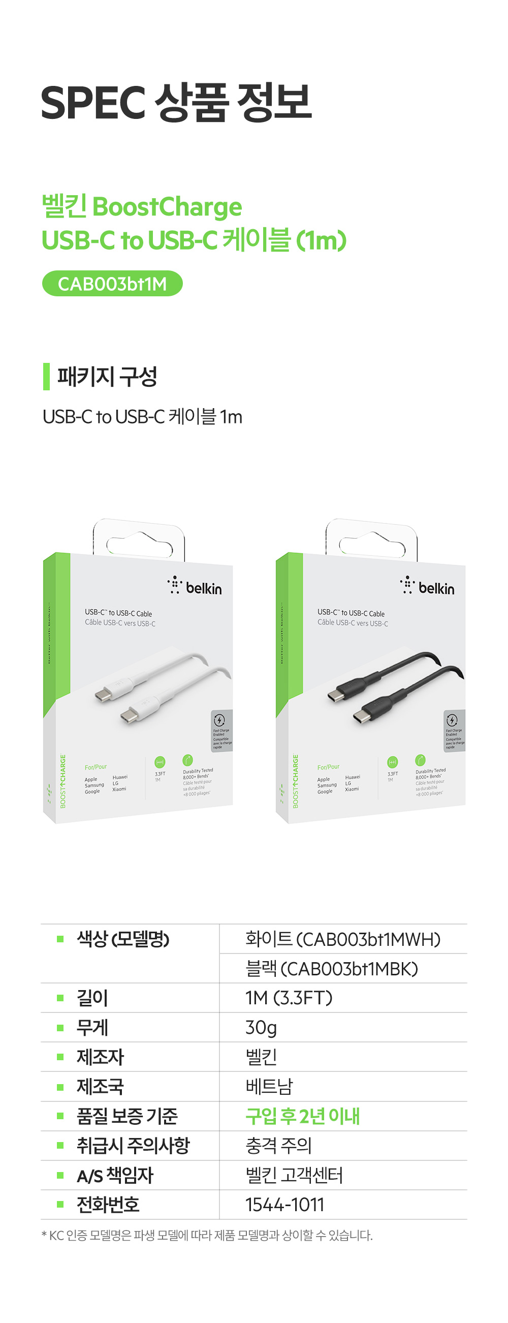 벨킨 부스트업 USB-C to C타입 고속 충전 케이블 1M CAB003bt1M 화이트